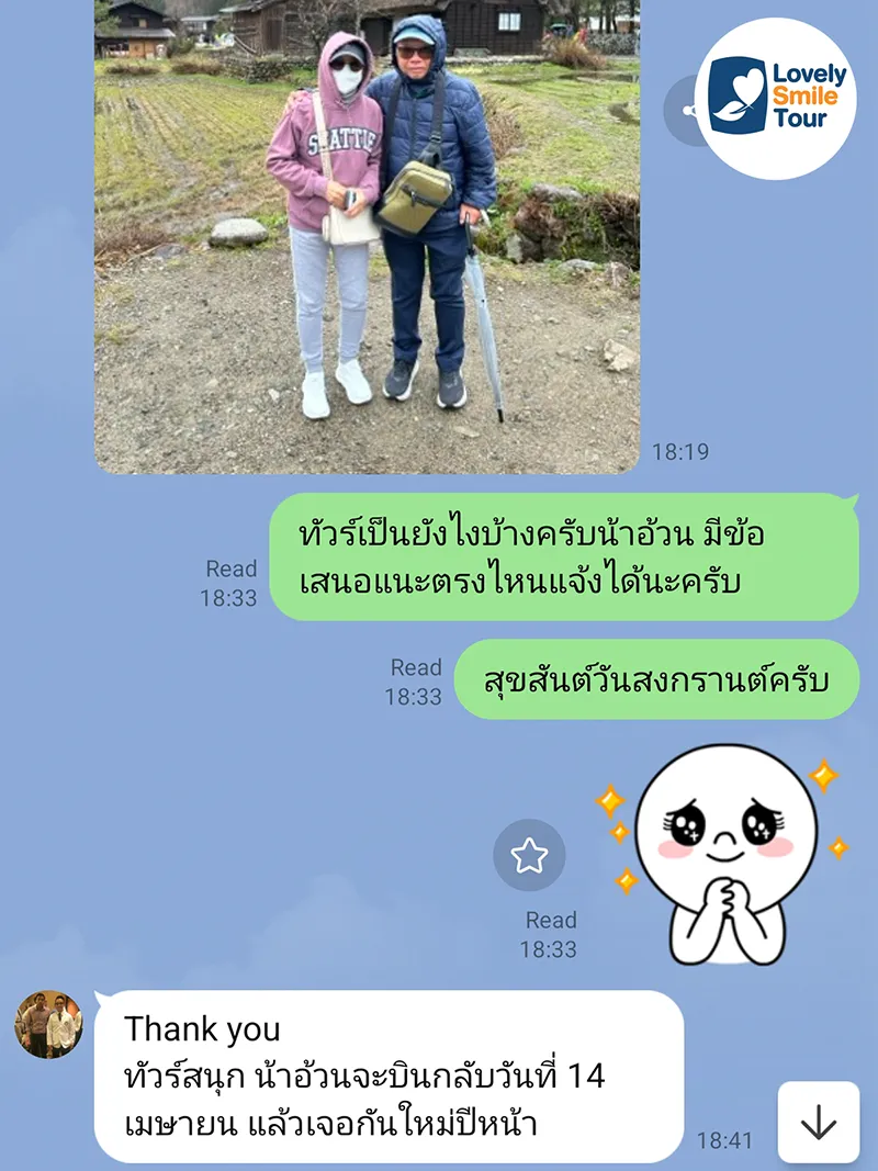 ทัวร์ญี่ปุ่น โอซาก้า ทาคายาม่า 31-4 เม.ย. 69 Home รีวิวลูกค้า ทัวร์ญี่ปุ่น โอซาก้า ทาคายาม่า 31-4 เม.ย. 69 รีวิวลูกค้าCheck in Groupพาร์ทเนอร์รีวิวลูกค้าไปทัวร์ญี่ปุ่น แชร์บทความนี้ รหัสทัวร์CXJKIX9โปรแกรมทัวร์โอซาก้า ทาคายาม่า ซากุระ 5วัน3คืน เที่ยวเต็มไม่มีอิสระสายการบินไทยแอร์เอเชียเอ็กซ์วันเดินทาง31 มีนาคม – 4 เมษายน 2569ชื่อลูกค้าคุณน้าอ้วน และคุณน้าหงส์ แชร์บทความนี้