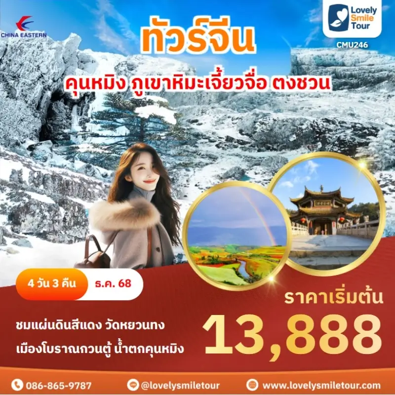 ทัวร์จีน – คุนหมิง ภูเขาหิมะเจี้ยวจื่อ ตงชวน ชมแผ่นดินสีแดง วัดหยวนทง - เมืองโบราณกวนตู้ น้ำตกคุนหมิง CMU246 ราคาเริ่มต้น 13888 จำนวนวัน 4 วัน 3 คืน สายการบิน ระดับโรงแรม ดาวน์โหลด PDF จองผ่านไลน์ โทรจองเลย 086-865-9787 วันเดินทางราคาผู้ใหญ่20 - 23 ธ.ค. 256815,888 test