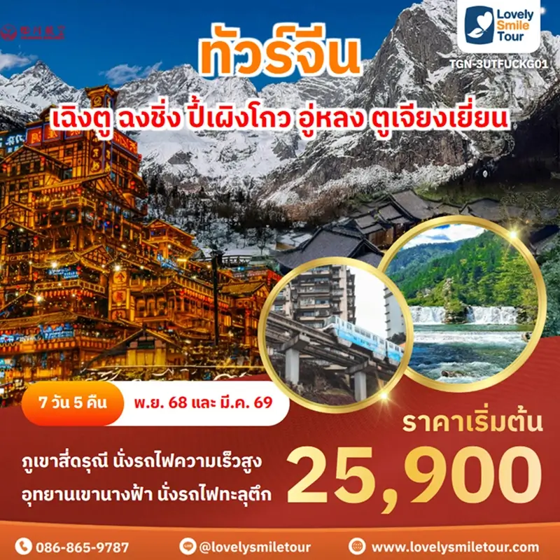 ทัวร์จีน – เฉิงตู ฉงชิ่ง ปี้เผิงโกว อู่หลง ตูเจียงเยี่ยน ภูเขาสี่ดรุณี นั่งรถไฟความเร็วสูง - อุทยานเขานางฟ้า นั่งรถไฟทะลุตึก TGN-3UTFUCKG01 ราคาเริ่มต้น 25900 จำนวนวัน 7 วัน 5 คืน สายการบิน ระดับโรงแรม ดาวน์โหลด PDF จองผ่านไลน์ โทรจองเลย 086-865-9787 วันเดินทางราคาผู้ใหญ่06 พ.ย. 68 - 12 พ.ย. 6825,90026 มี.ค. 69 - 01 เม.ย. 6925,900