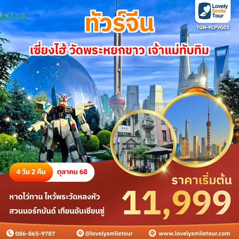 ทัวร์จีน – เซี่ยงไฮ้ วัดพระหยกขาว เจ้าแม่ทับทิม หาดไว่ทาน ไหว้พระวัดหลงหัว - สวนนอร์ทบันด์ เทียนอันเชียนซู่ TGN-9CPVG01 ราคาเริ่มต้น 11999 จำนวนวัน 4 วัน 2 คืน สายการบิน ระดับโรงแรม ดาวน์โหลด PDF จองผ่านไลน์ โทรจองเลย 086-865-9787 วันเดินทางราคาผู้ใหญ่21 ต.ค. 68 - 24 ต.ค. 6813,990
