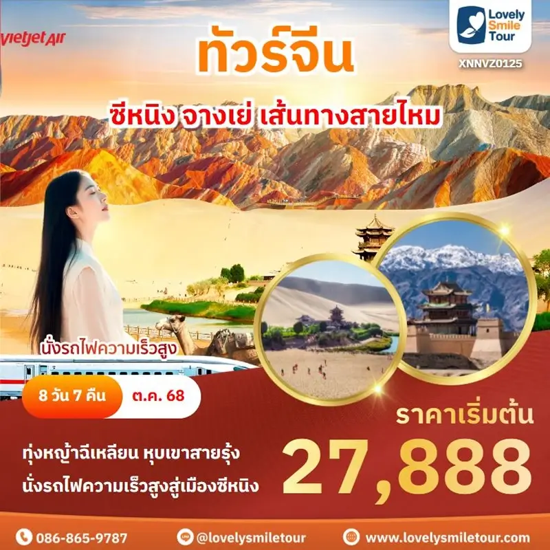 ทัวร์จีน – ซีหนิง จางเย่ เส้นทางสายไหม ทุ่งหญ้าฉีเหลียน หุบเขาสายรุ้ง - นั่งรถไฟความเร็วสูงสู่เมืองซีหนิง XNNVZ0125 ราคาเริ่มต้น 27888 จำนวนวัน 8 วัน 7 คืน สายการบิน ระดับโรงแรม ดาวน์โหลด PDF จองผ่านไลน์ โทรจองเลย 086-865-9787 วันเดินทางราคาผู้ใหญ่20 - 27 ต.ค. 68 28,88827 ต.ค. - 03 พ.ย. 256828,888
