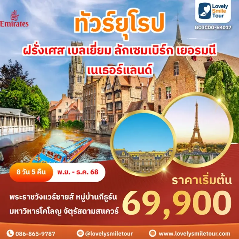 ทัวร์ยุโรป – ฝรั่งเศส เบลเยี่ยม ลักเซมเบิร์ก เยอรมนี เนเธอร์แลนด์ พระราชวังแวร์ซายส์ หมู่บ้านกีธูร์น - มหาวิหารโคโลญ จัตุรัสดามสแควร์ GO3CDG-EK017 ราคาเริ่มต้น 69900 จำนวนวัน 8 วัน 5 คืน สายการบิน ระดับโรงแรม ดาวน์โหลด PDF จองผ่านไลน์ โทรจองเลย 086-865-9787 วันเดินทางราคาผู้ใหญ่06 - 13 พ.ย. 6871,90001 - 08 ธ.ค. 6872,900