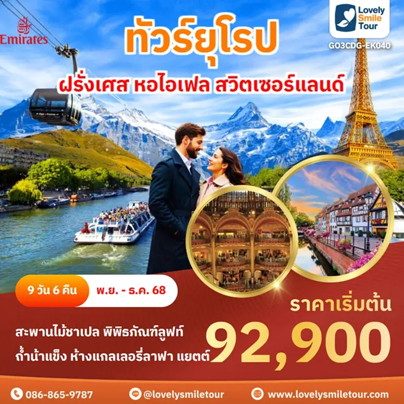 ทัวร์ยุโรป – ฝรั่งเศส หอไอเฟล สวิตเซอร์แลนด์ สะพานไม้ชาเปล พิพิธภัณฑ์ลูฟท์ - ถ้ำน้าแข็ง ห้างแกลเลอรี่ลาฟา แยตต์ GO3CDG-EK040 ราคาเริ่มต้น 92900 จำนวนวัน 9 วัน 6 คืน สายการบิน ระดับโรงแรม ดาวน์โหลด PDF จองผ่านไลน์ โทรจองเลย 086-865-9787 วันเดินทางราคาผู้ใหญ่12 - 20 พ.ย. 68 93,90002 - 10 ธ.ค. 6894,90027 ธ.ค. - 04 ม.ค. 6999,900