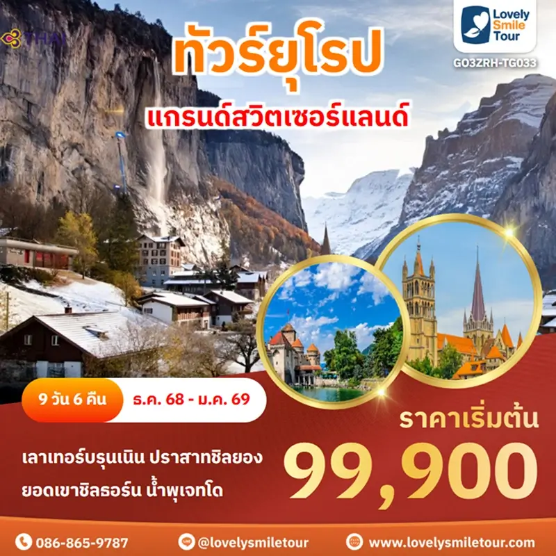 ทัวร์ยุโรป – แกรนด์สวิตเซอร์แลนด์ เลาเทอร์บรุนเนิน ปราสาทชิลยอง - ยอดเขาชิลธอร์น น้ำพุเจทโด GO3ZRH-TG033 ราคาเริ่มต้น 99900 จำนวนวัน 9 วัน 6 คืน สายการบิน ระดับโรงแรม ดาวน์โหลด PDF จองผ่านไลน์ โทรจองเลย 086-865-9787 วันเดินทางราคาผู้ใหญ่25 ธ.ค. - 02 ม.ค.119,90029 ธ.ค. - 06 ม.ค.119,900
