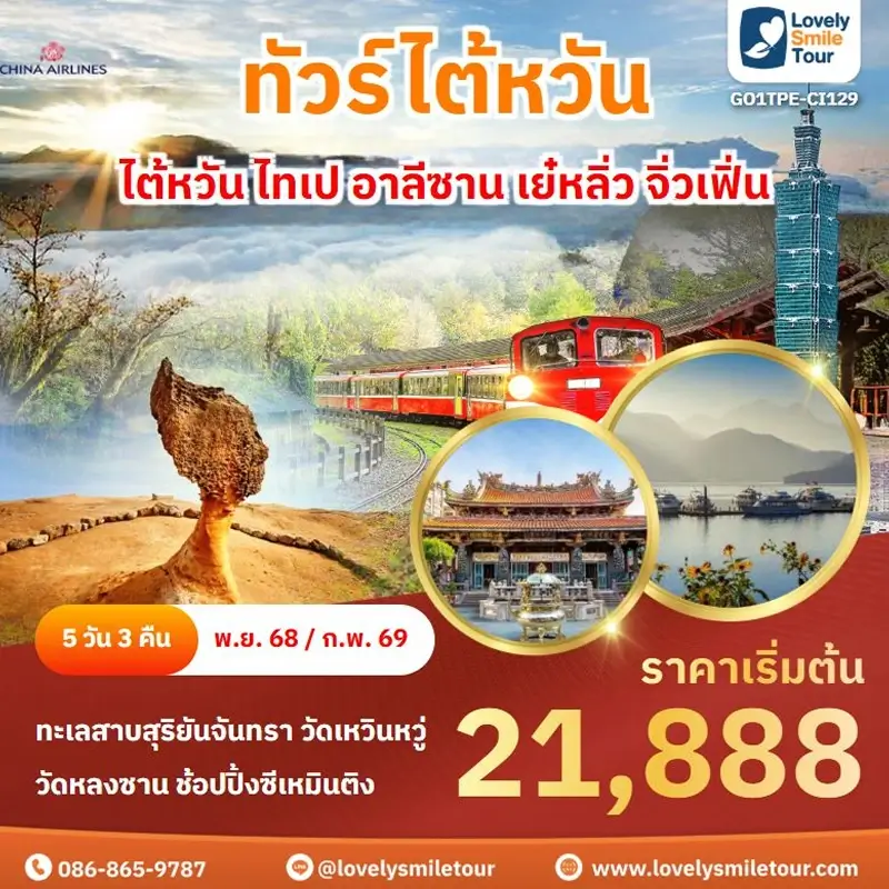 ทัวร์ไต้หวัน – ไต้หวัน ไทเป อาลีซาน เย๋หลิ่ว จิ่วเฟิ่น ทะเลสาบสุริยันจันทรา วัดเหวินหวู่ - วัดหลงซาน ช้อปปิ้งซีเหมินติง GO1TPE-CI129 ราคาเริ่มต้น 21888 จำนวนวัน 5 วัน 3 คืน สายการบิน ระดับโรงแรม ดาวน์โหลด PDF จองผ่านไลน์ โทรจองเลย 086-865-9787 วันเดินทางราคาผู้ใหญ่13 - 17 พ.ย. 6822,88827 พ.ย. - 01 ธ.ค. 6822,88805 - 09 ก.พ. 6922,888