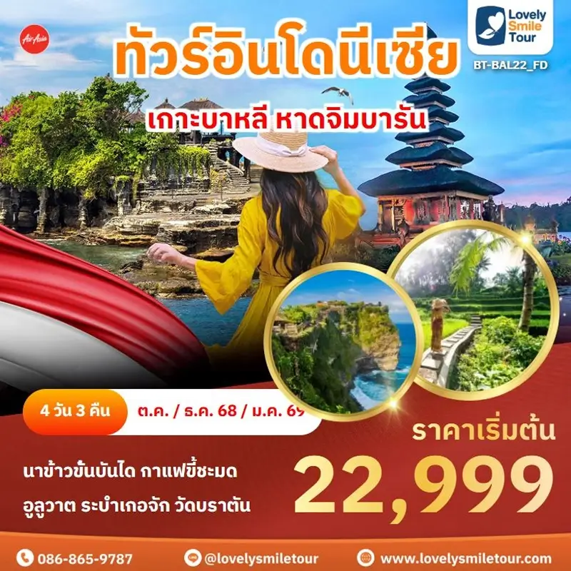ทัวร์อินโดนีเซีย – เกาะบาหลี หาดจิมบารัน นาข้าวข้ันบันได กาแฟขี้ชะมด - อูลูวาต ระบำเกอจัก วัดบราตัน BT-BAL22_FD ราคาเริ่มต้น 22999 จำนวนวัน 4 วัน 3 คืน สายการบิน ระดับโรงแรม ดาวน์โหลด PDF จองผ่านไลน์ โทรจองเลย 086-865-9787 วันเดินทางราคาผู้ใหญ่10-13 ต.ค. 6824,99923-26 ต.ค. 6824,99904 - 07 ธ.ค. 6824,99929 - 01 ก.พ. 6923,999