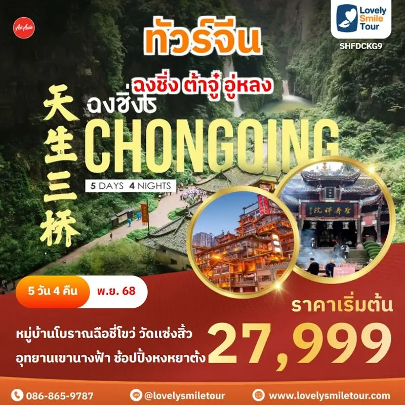 ทัวร์จีน – ฉงชิ่ง ต้าจู๋ อู่หลง หมู่บ้านโบราณฉือชี่โขว่ วัดเเซ่งสิ้ว - อุทยานเขานางฟ้า ช้อปปิ้งหงหยาต้ง SHFDCKG9 ราคาเริ่มต้น 27999 จำนวนวัน 5 วัน 4 คืน สายการบิน ระดับโรงแรม ดาวน์โหลด PDF จองผ่านไลน์ โทรจองเลย 086-865-9787 วันเดินทางราคาผู้ใหญ่12 พ.ย. 68 - 16 พ.ย. 6827,999