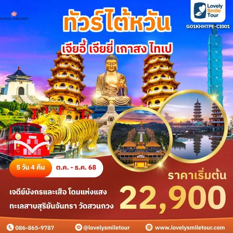 ทัวร์ไต้หวัน – เจียอี้ เจียยี่ เกาสง ไทเป เจดีย์มังกรและเสือ โดมแห่งแสง - ทะเลสาบสุริยันจันทรา วัดสวนกวง GO1KHHTPE-CI001 ราคาเริ่มต้น 22900 จำนวนวัน 5 วัน 4 คืน สายการบิน ระดับโรงแรม ดาวน์โหลด PDF จองผ่านไลน์ โทรจองเลย 086-865-9787 วันเดินทางราคาผู้ใหญ่31 ต.ค. - 04 พ.ย. 6824,90007 - 11 พ.ย. 6823,90028 พ.ย. - 02 ธ.ค. 6823,900