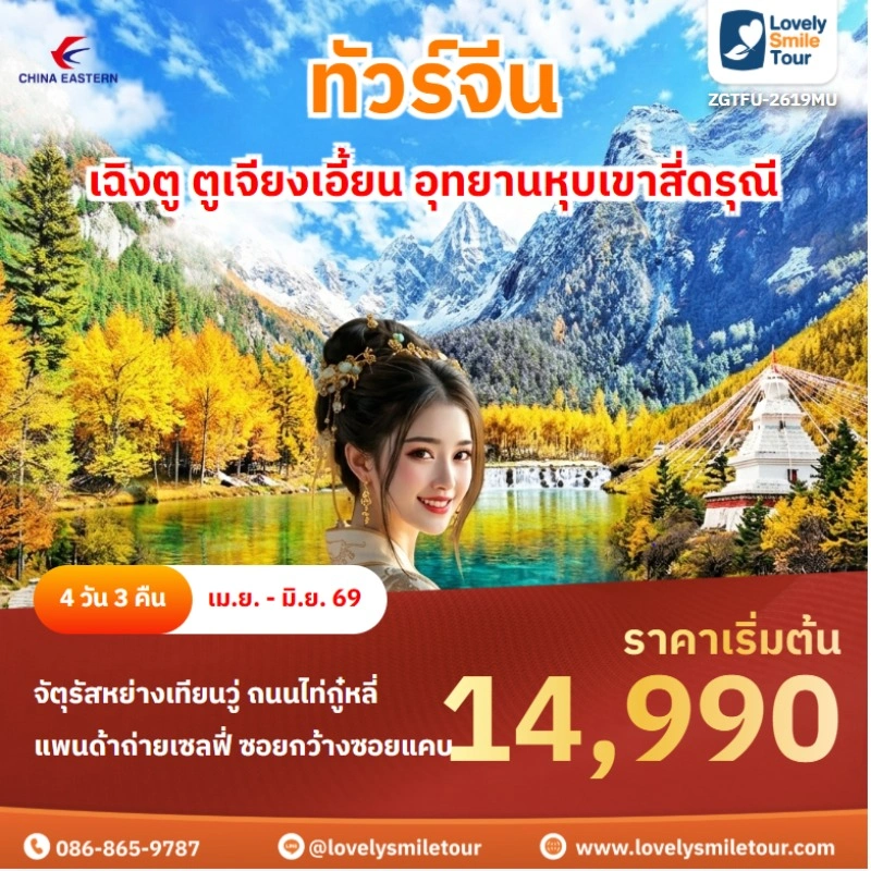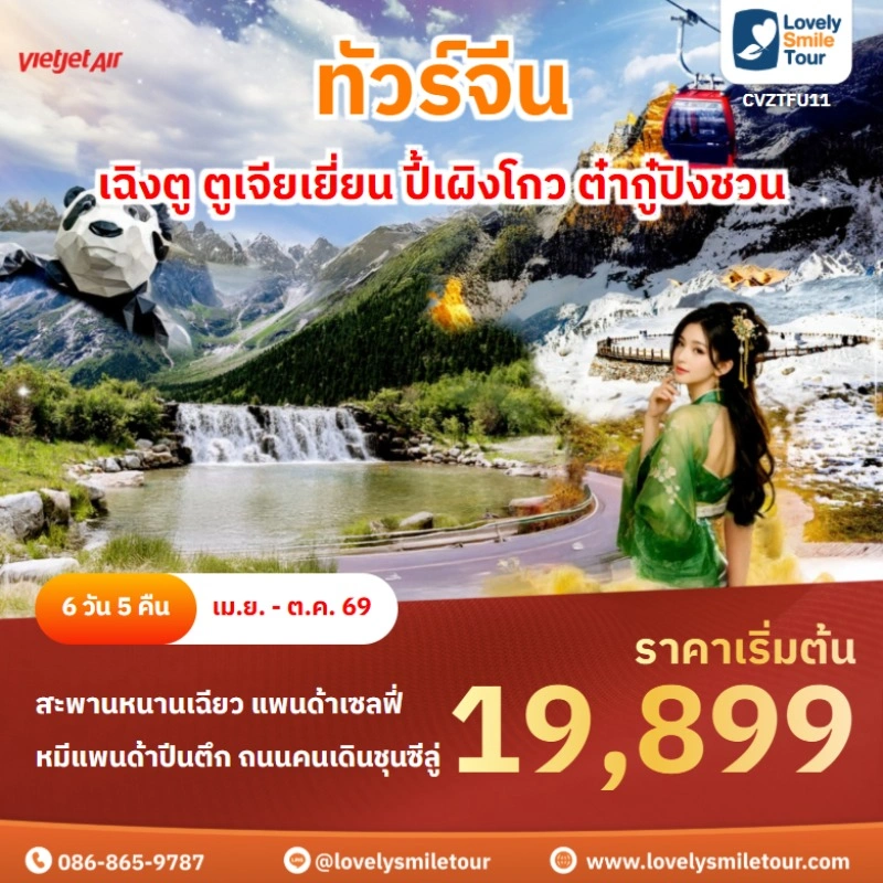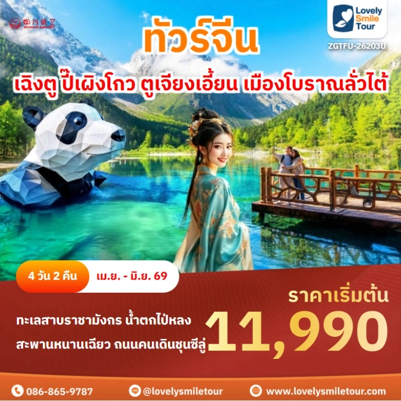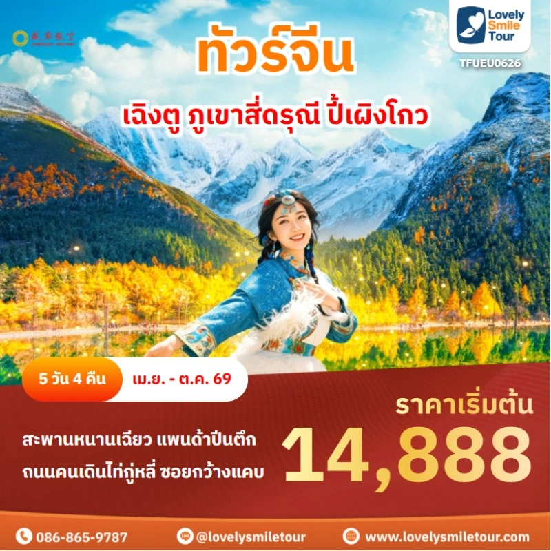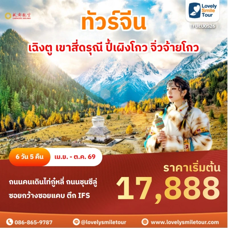 Lovely Smile Tour มีแพ็กเกจ ทัวร์เฉิงตู สี่ดรุณี หวงหลง จิ่วจ้ายโกว ให้เลือกหลายรูปแบบ มีทั้งแบบไม่เข้าร้านรัฐบาลและแบบเข้าร้านรัฐบาล พักโรงแรมระดับ 4-5 ดาว สายการบินมีทั้งแบบ Full Service และ Low Cost หากสนใจจองแพ็กเกจไหน แอดไลน์หรือโทรสอบถามได้เลย