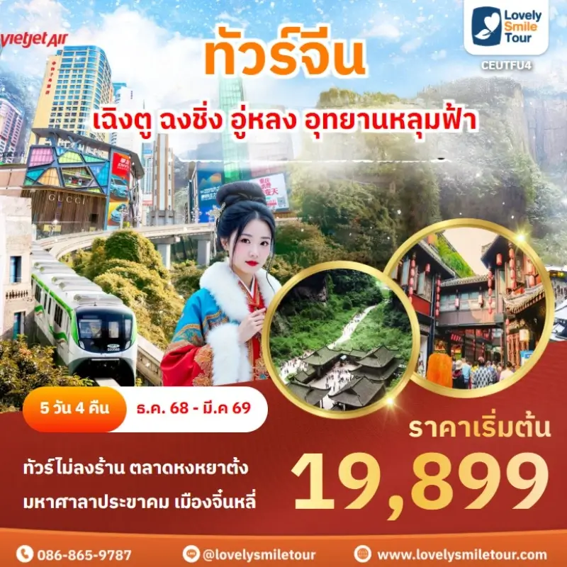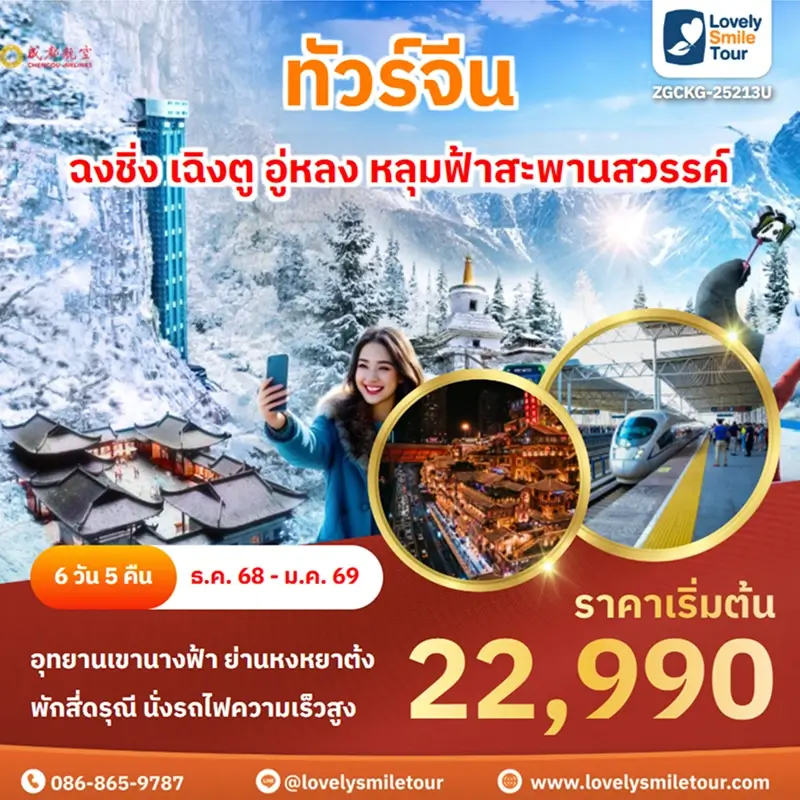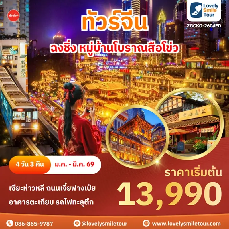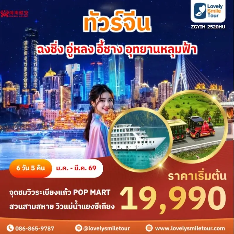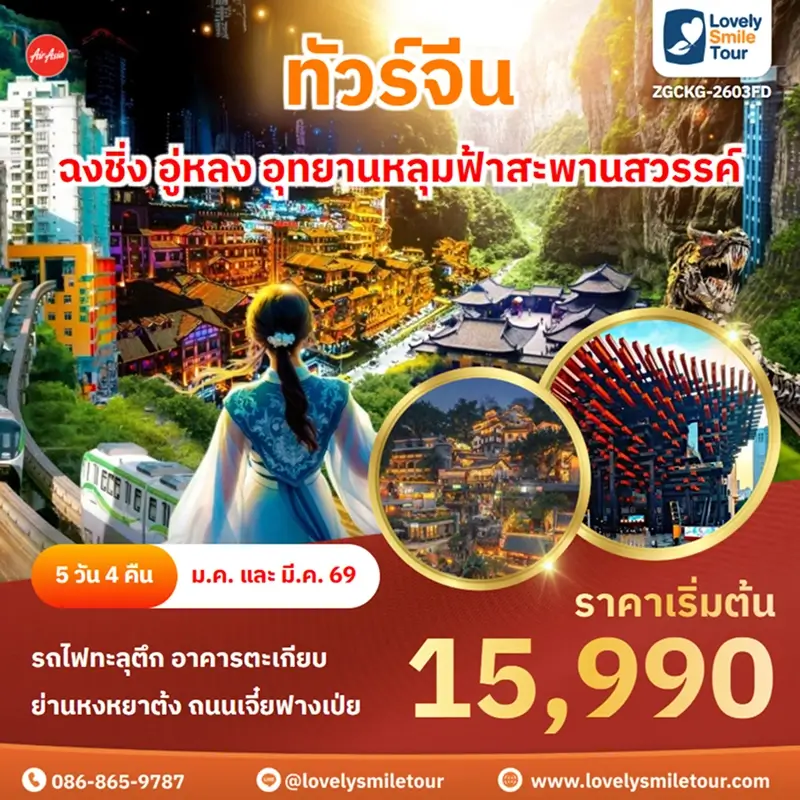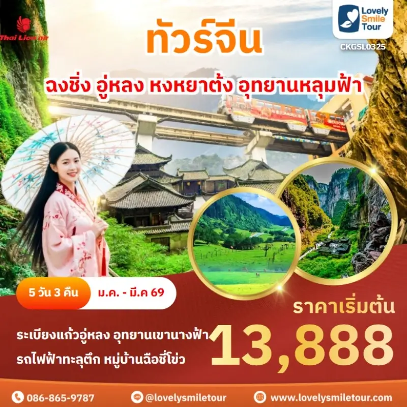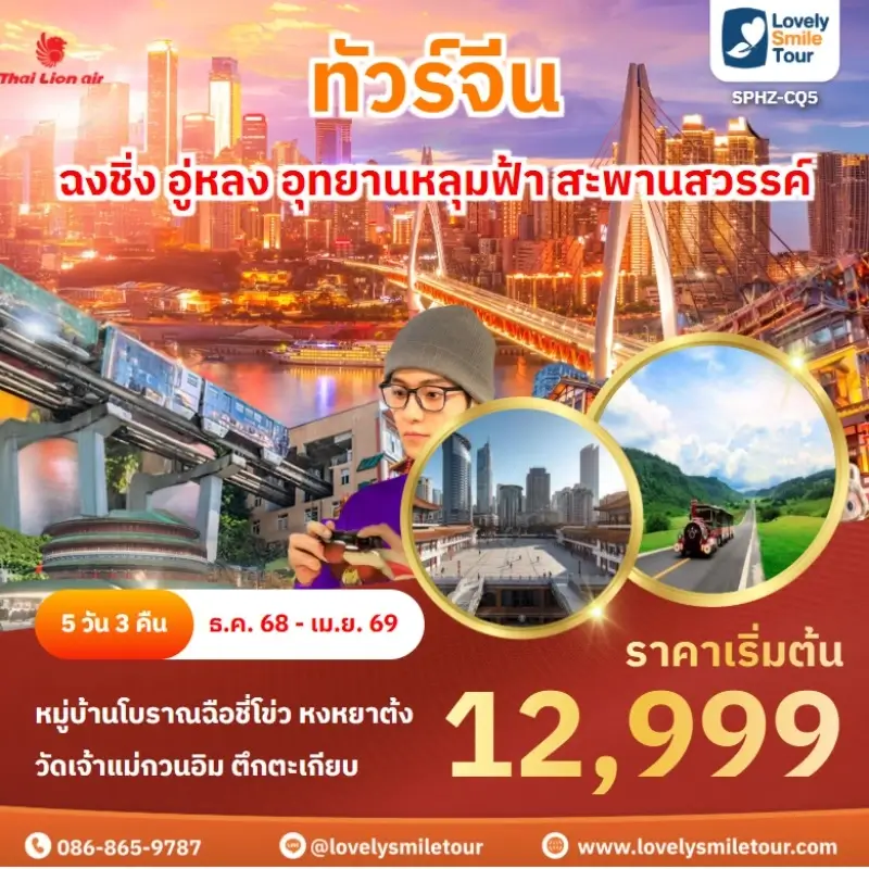 Lovely Smile Tour มีแพ็กเกจ ทัวร์ฉงชิ่ง ให้เลือกหลายรูปแบบ มีทั้งแบบไม่เข้าร้านรัฐบาลและแบบเข้าร้านรัฐบาล พักโรงแรมระดับ 4-5 ดาว สายการบินมีทั้งแบบ Full Service และ Low Cost หากสนใจจองแพ็กเกจไหน แอดไลน์หรือโทรสอบถามได้เลย