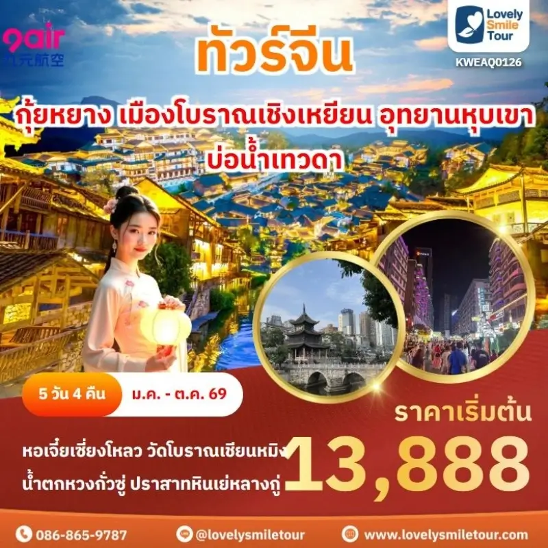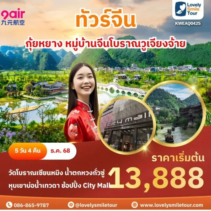 หากท่านกำลังสนใจไปเที่ยวประเทศจีนในเส้นทางใหม่ๆ ที่นักท่องเที่ยวยังไม่เยอะมาก ธรรมชาติยังสวยงามอยู่ แนะนำเส้นทางนี้เลย ทัวร์กุ้ยหยาง (Guiyang) ซึ่งอยู่ที่มณฑลกุ้ยโจว (Guizhou) เหมาะกับท่านที่อยากเที่ยวสบายๆ นั่งรถไม่เหนื่อย อากาศสบายๆ โดยรัฐบาลกุ้ยหยางได้ให้ทางบริษัททัวร์ในประเทศไทยช่วยโปรโมทเส้นทางอย่างเป็นทางการเมื่อวันที่ 13 มิถุนายน 2568 สถานที่เที่ยวทัวร์จีน กุ้ยหยาง แต่ละที่จะสวยงามขนาดไหน ลองดูรีวิว