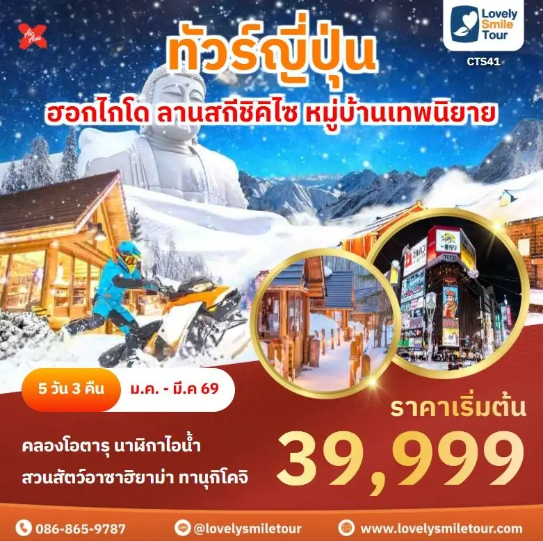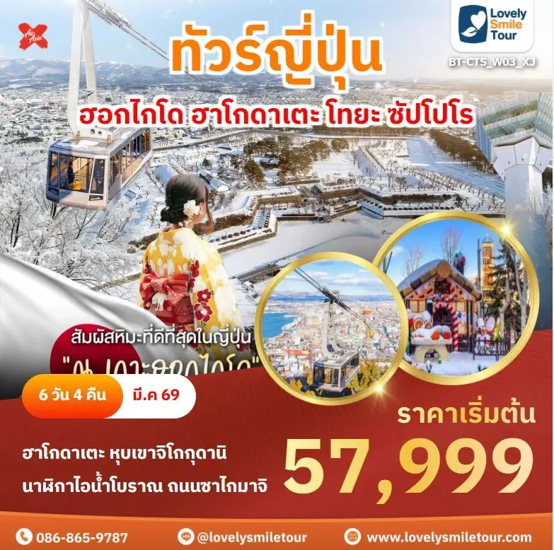 Lovely Smile Tour มีแพ็กเกจ ทัวร์ฮอกไกโด หลากหลายแพ็กเกจให้เลือก ซึ่งฮอกไกโดเมืองที่คนนิยมไปเที่ยวกันในช่วงปลายปี เนื่องจากเป็นเมืองที่อยู่ทางตอนเหนือของญี่ปุ่น อากาศจึงเย็นสบายตลอดทั้งปี มีสถานที่ท่องเที่ยวสวยๆ และยังมีดีเรื่องอาหารอีกด้วย สถานที่ท่องเที่ยวที่เด่นๆ จะอยู่ที่หมู่บ้านเทพนิยายนิงเกิ้ลเทอเรส หอนาฬิกาเมืองซัปโปโร คลองโอตารุ พิพิธภัณฑ์กล่องดนตรีโอตารุ และยังมีสถานที่ท่องเที่ยวที่น่าสนใจอีกมากมาย ถ้าหากสนใจเที่ยวสถานที่สวยงามและสัมผัสกับอากาศเย็นแบบนี้ แอดไลน์หรือโทรสอบถามได้เลย