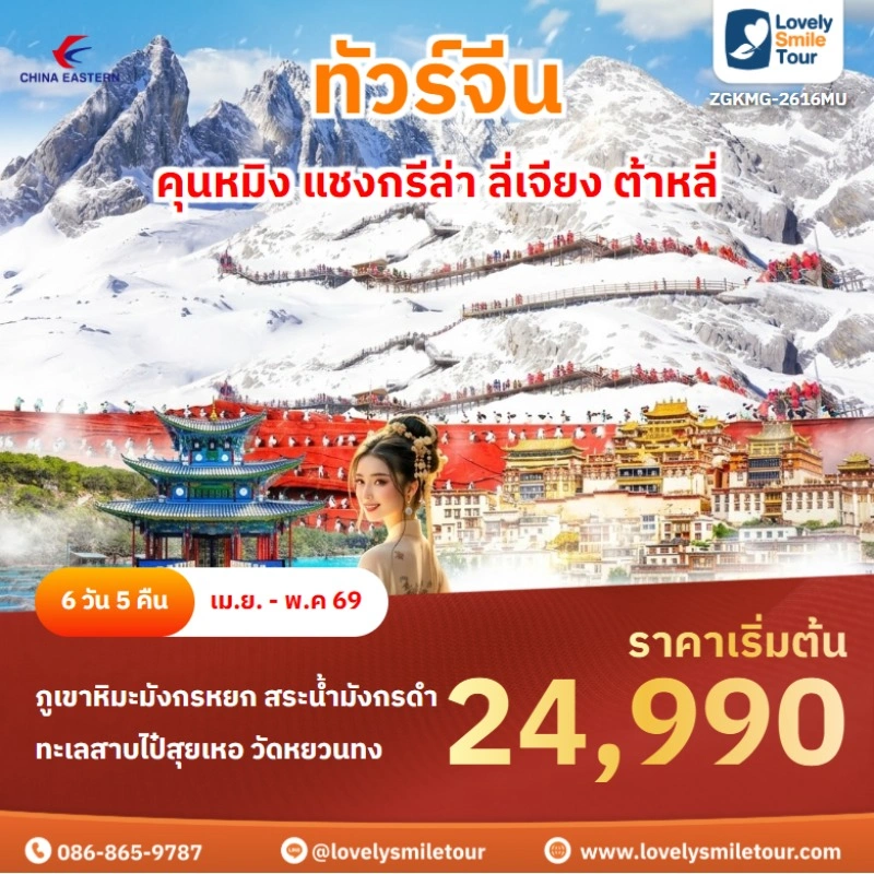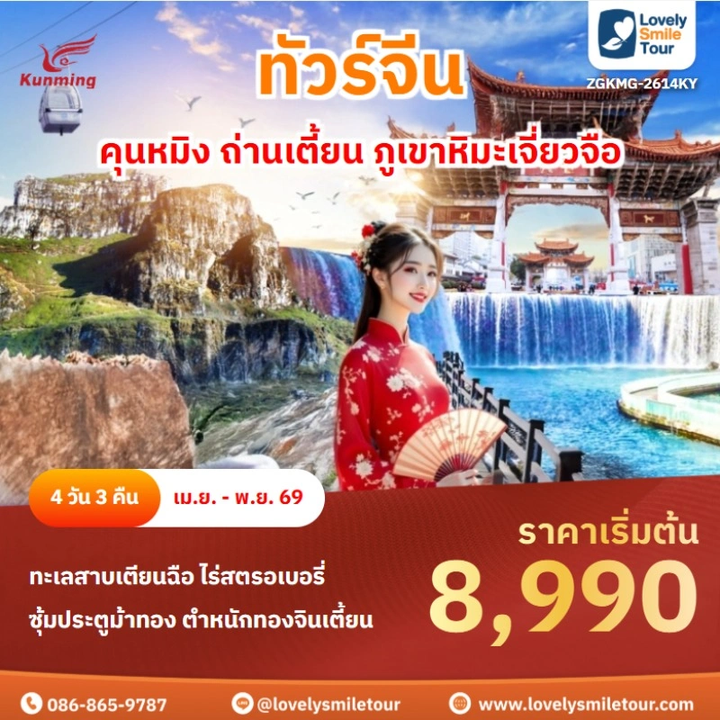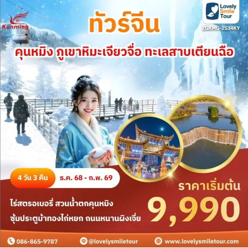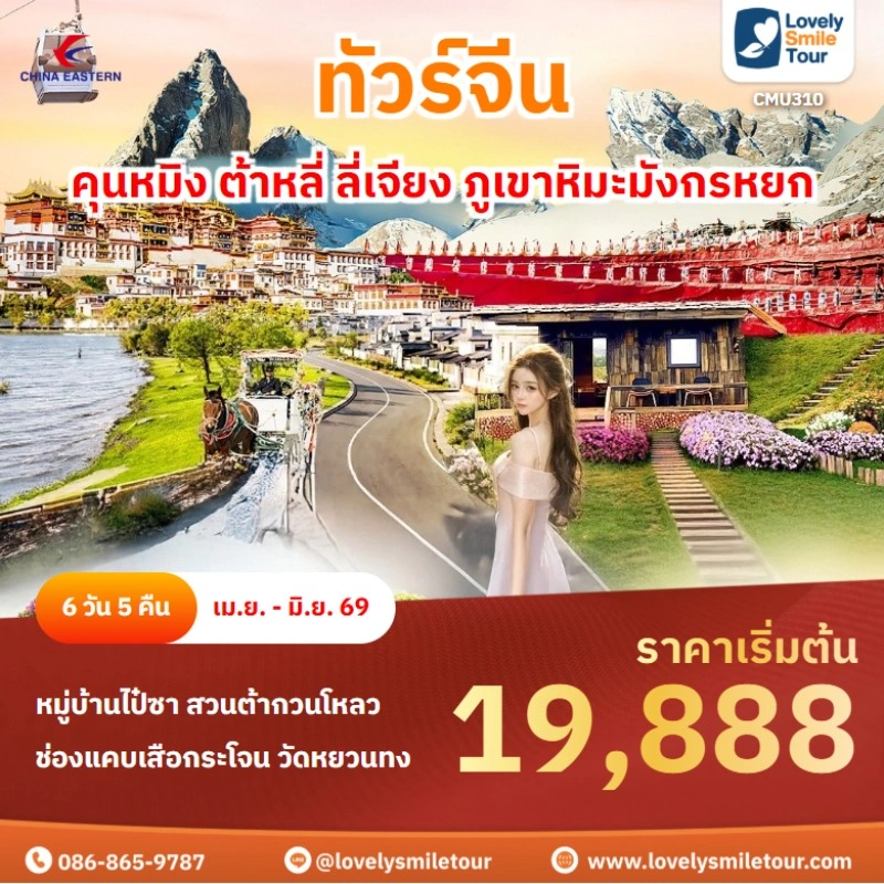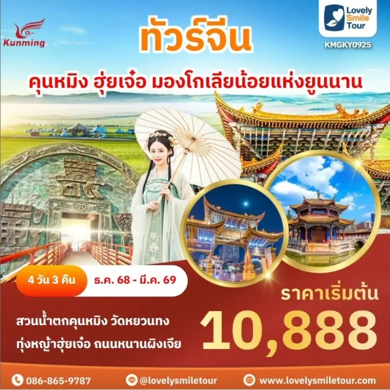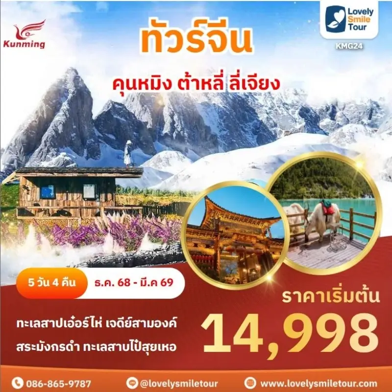 Lovely Smile Tour มีแพ็กเกจ ทัวร์คุนหมิง ต้าหลี่ ลี่เจียง แชงกรีล่า ภูเขาหิมะมังกรหยก ให้เลือกหลายรูปแบบ มีทั้งแบบไม่เข้าร้านรัฐบาลและแบบเข้าร้านรัฐบาล พักโรงแรมระดับ 4-5 ดาว สายการบินมีทั้งแบบ Full Service และ Low Cost บางแพ็กเกจได้นั่งรถไฟความเร็วสูง หากสนใจจองแพ็กเกจไหน แอดไลน์หรือโทรสอบถามได้เลย