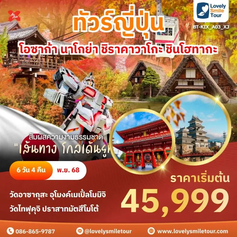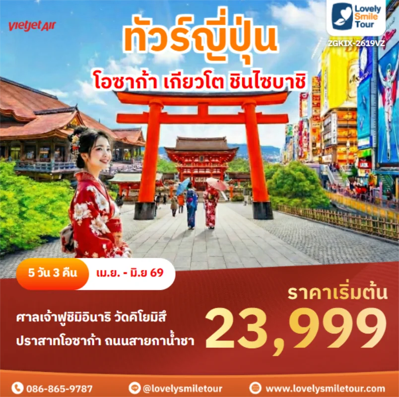 Lovely Smile Tour มีแพ็กเกจ ทัวร์โอซาก้า หลากหลายแพ็กเกจให้เลือก โอซาก้าเป็นเมืองที่มีสถานที่ท่องเที่ยวให้เที่ยวครบ ทั้งวัด สวนสนุก สถาปัตยกรรมญี่ปุ่นแบบโบราณ และย่านช็อปปิ้ง ซึ่งมีความสวยงามไม่แพ้โตเกียว สถานที่ท่องเที่ยวที่ที่เด่นๆ จะมีปราสาทโอซาก้า สวนอนุสรณ์งานเอ๊กซ์โป 70 ย่านโดทงโบริ ย่านชินไซบาชิ และยังมีสวนสนุกชื่อดังอย่างยูนิเวอร์แซลสตูดิโอส์เจแปนอีกด้วย ถ้าสนใจจองแพ็กเกจไหน แอดไลน์หรือโทรสอบถามได้เลย