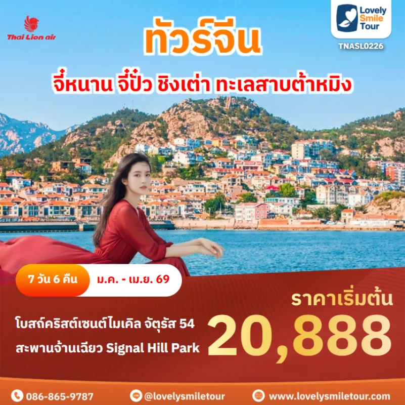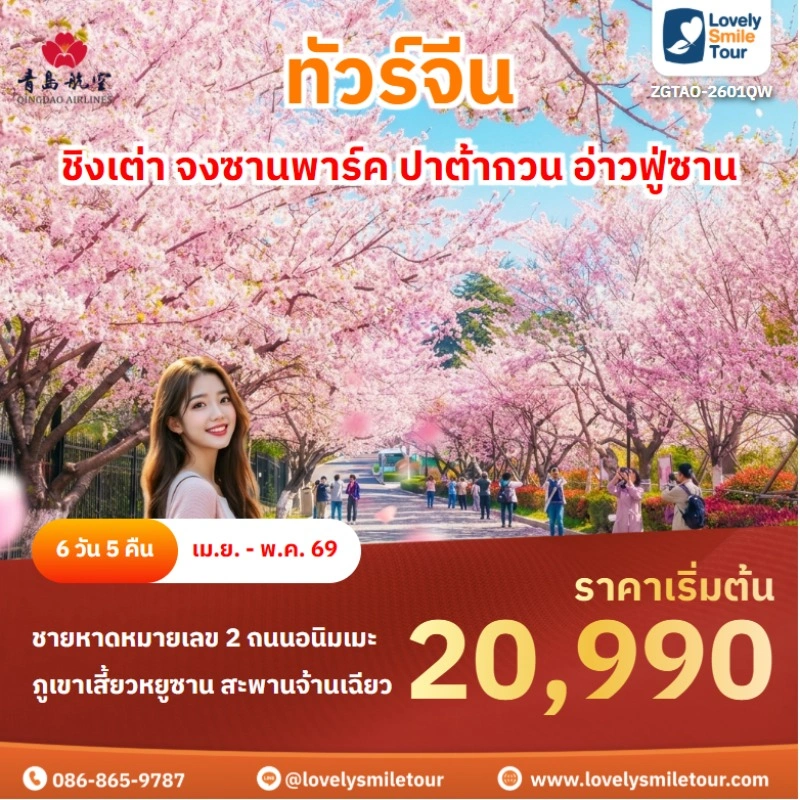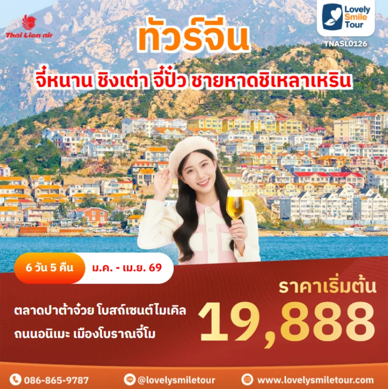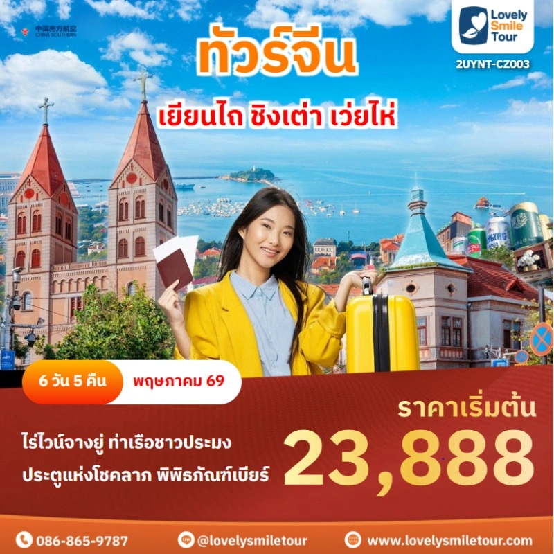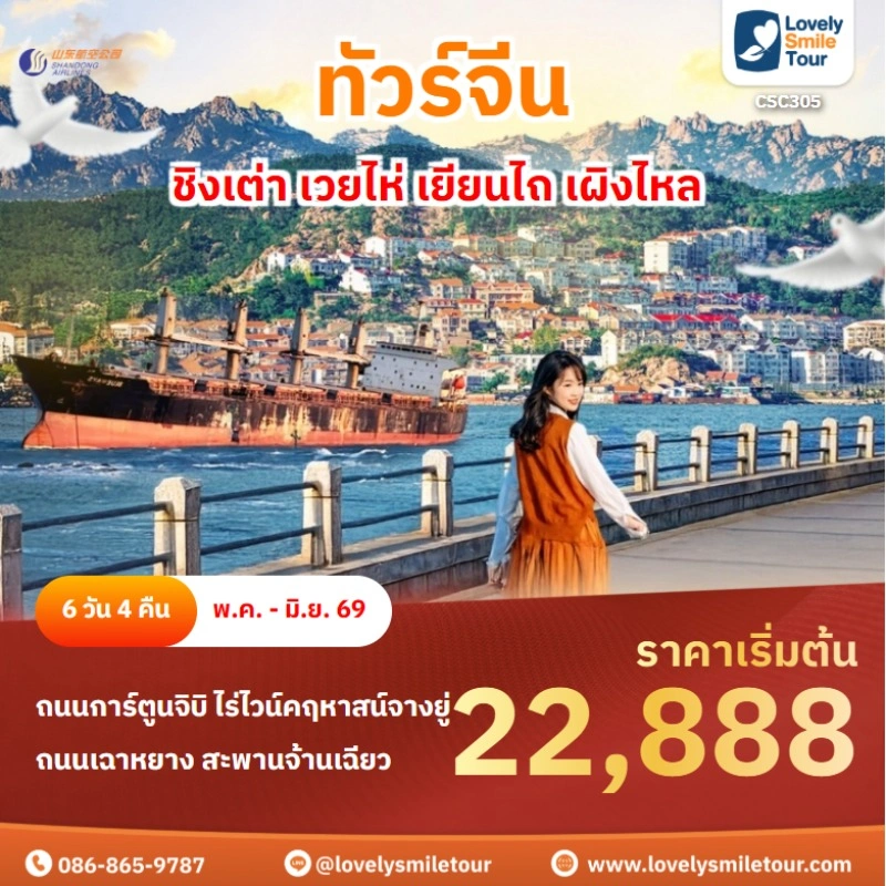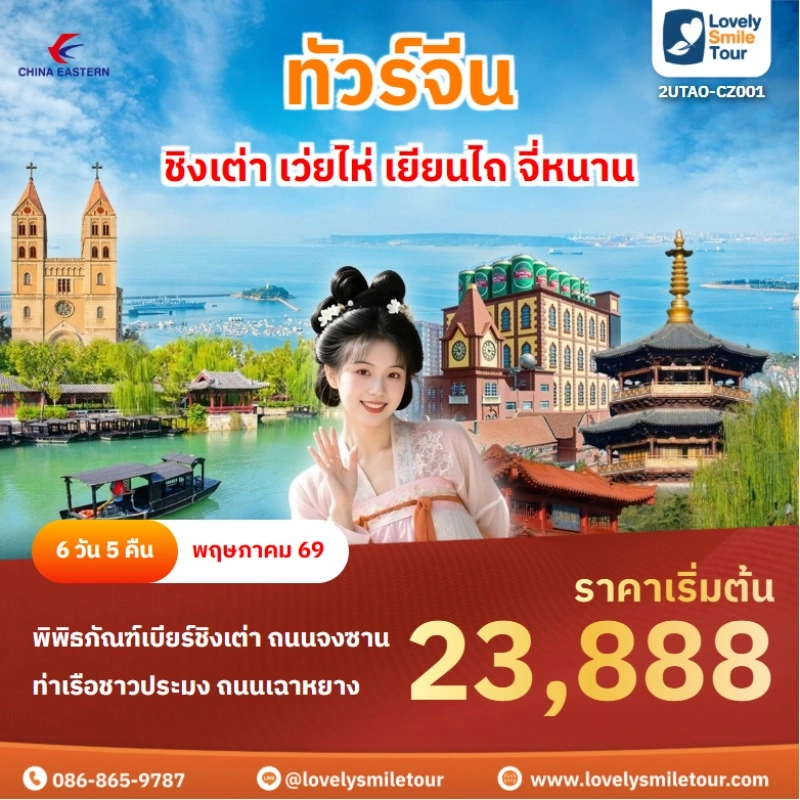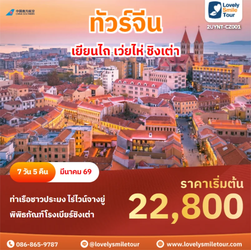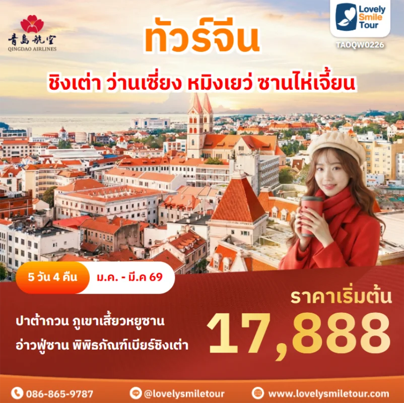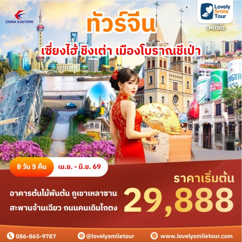 Lovely Smile Tour มีแพ็กเกจ ทัวร์ชิงเต่า ให้เลือกหลายรูปแบบ มีทั้งแบบไม่เข้าร้านรัฐบาลและแบบเข้าร้านรัฐบาล พักโรงแรมระดับ 4-5 ดาว บางโปรแกรมมีให้นั่งรถไฟความเร็วสูง หากสนใจจองแพ็กเกจไหน แอดไลน์หรือโทรสอบถามได้เลย