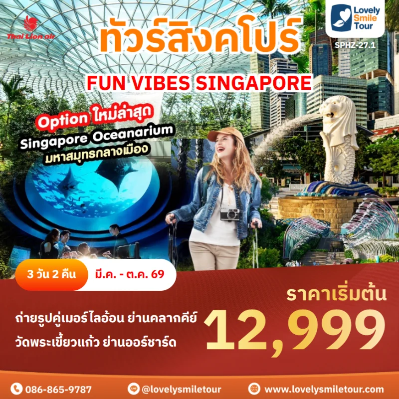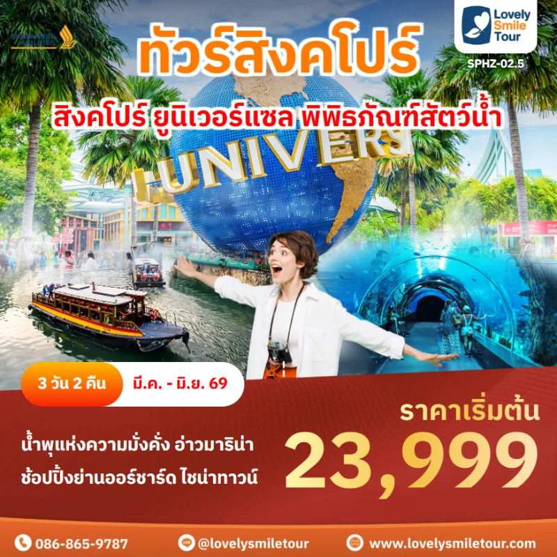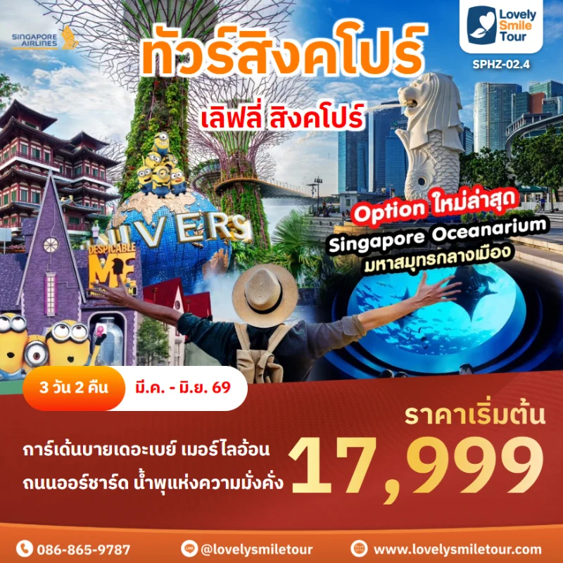 Lovely Smile Tour มีแพ็กเกจ ทัวร์สิงคโปร์ หลากหลายรูปแบบให้เลือก ทั้งแบบ 3 วัน 2 คืน แบบ 4 วัน 3 คืน หรือจะเป็นแบบมีวันอิสระเที่ยวเอง 1 วัน หรือแบบพาเที่ยวทุกวัน มีไกด์ มีรถบัสบริการ สามารถซื้อ Option แบบรวมค่าบัตร Universal Studios Singapore ได้ด้วย สนใจจองแพ็กเกจไหน สามารถแอดไลน์ หรือโทรสอบถามได้เลย