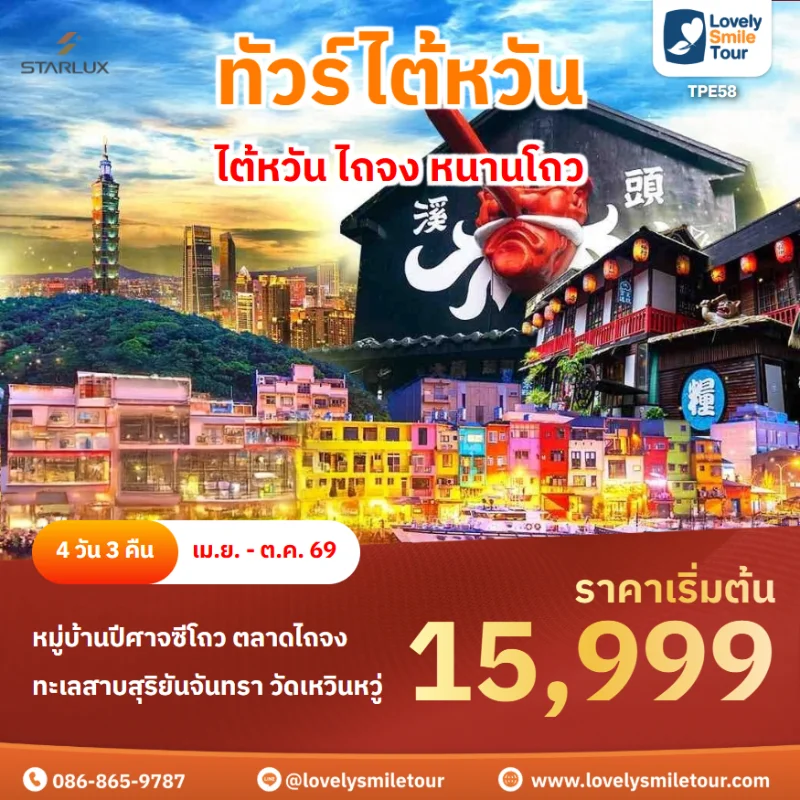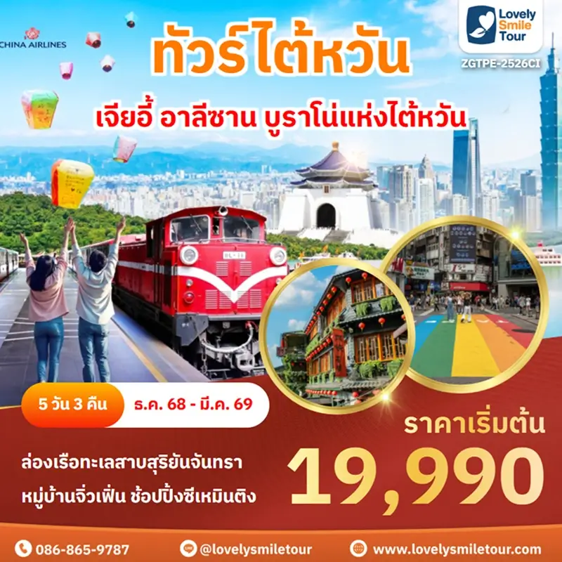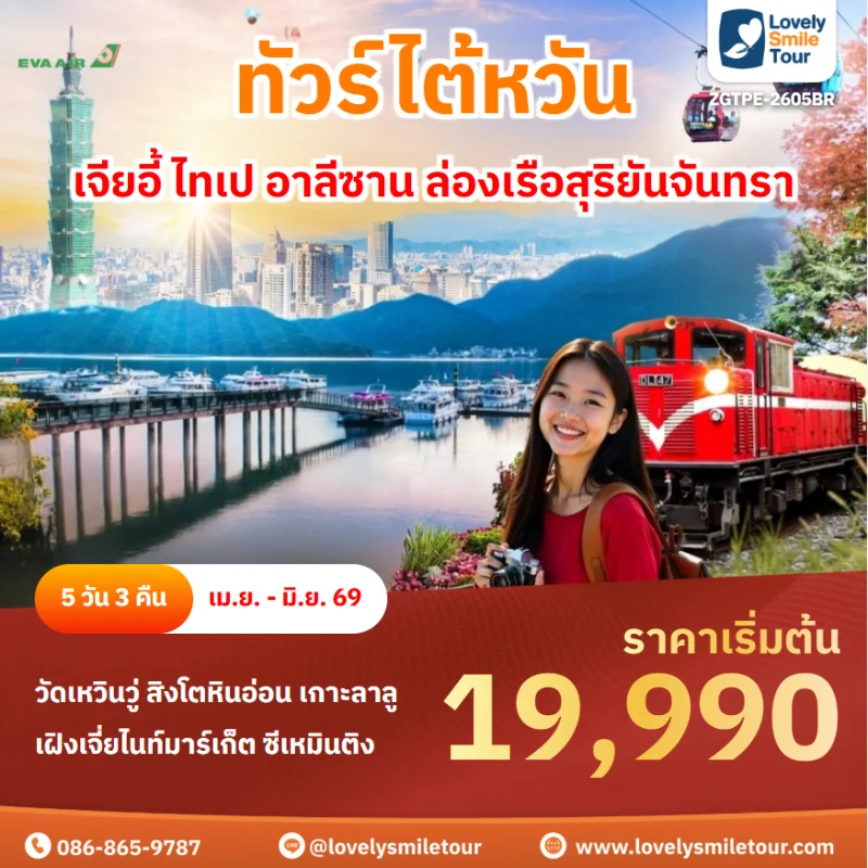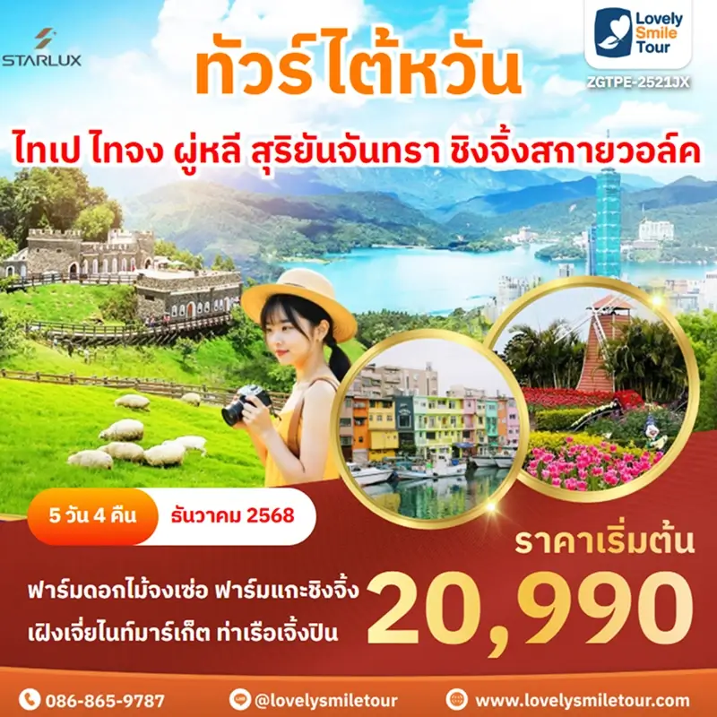 Lovely Smile Tour มีแพ็กเกจ ทัวร์ไต้หวัน ให้เลือกหลายรูปแบบ โดยรูปแบบหลักๆ จะมี 2 อย่างคือ แพ็กเกจทัวร์ 4 วัน 3 คืน และ 5 วัน 4 คืน ถ้าต้องการเที่ยวครบ แนะนำให้ไปแบบ 5 วัน 4 คืน ซึ่งจะทำให้ได้ไปเที่ยวอุทยานแห่งชาติอาลีซาน นอกจากนี้ โปรแกรมทัวร์จะแตกต่างกันในเรื่องสายการบิน ระดับโรงแรม ร้านอาหารมื้อพิเศษ สนใจจองแพ็กเกจไหน แอดไลน์หรือโทรสอบถามได้เลย
