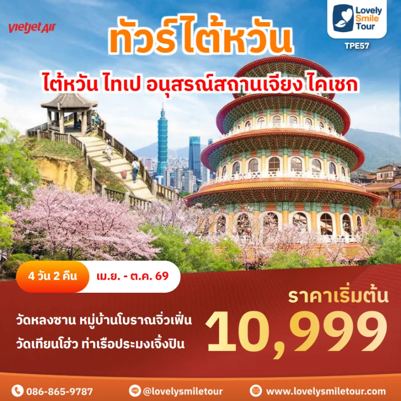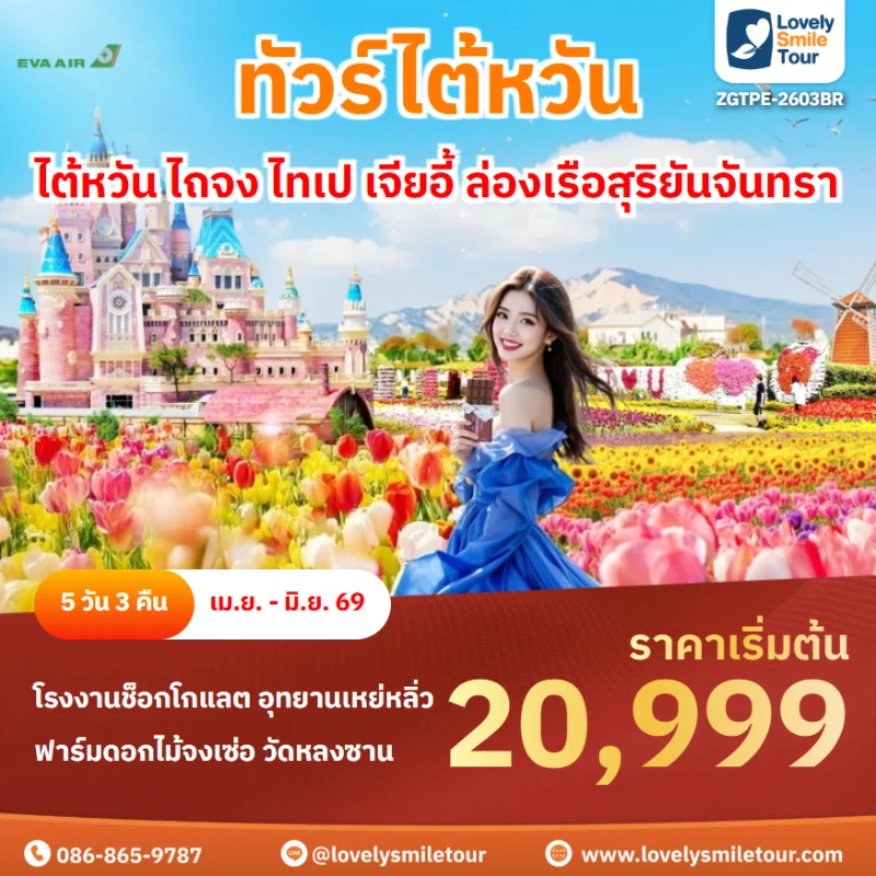 ไต้หวันเป็นอีกหนึ่งประเทศที่เป็นที่นิยมในการท่องเที่ยวเป็นอย่างมาก ไม่ว่าจะเป็นธรรมชาติที่งดงาม ภูเขา น้ำตก หมอก ทะเล และหมู่เกาะที่สวยงาม อีกทั้งยังมีเมืองโบราณและสถานที่สำคัญที่มีชื่อเสียงมากมายที่ได้รับความนิยมในหมู่นักท่องเที่ยว สนใจจองทัวร์ไต้หวัน สามารถแอดไลน์สอบถามได้เลยค่ะ LINE ID : @lovelysmiletour