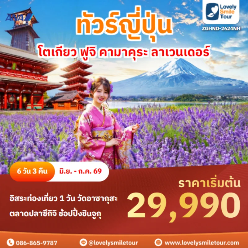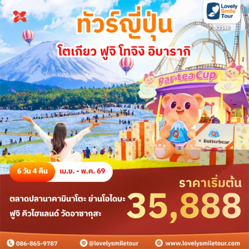 Lovely Smile Tour มีแพ็กเกจ ทัวร์โตเกียว หลากหลายแพ็กเกจให้เลือก โดยโตเกียวถือเป็นเมืองที่คนนิยมไปเที่ยวกันเป็นอันดับต้นๆ สถานที่ท่องเที่ยวเด่นๆ ก็จะมีภูเขาไฟฟูจิ คาวากูจิโกะ วัดอาซากุสะ ย่านช็อปปิ้งฮาราจุกุ ชิบูย่า และยังมีสวนสนุกชื่อดังอย่างดิสนีย์แลนด์ ดิสนีย์ซีอีกด้วย สำหรับท่านใดที่พาเด็กๆ มาเที่ยวด้วย บอกได้เลยว่าถูกใจแน่นอน และสำหรับท่านที่เดินทางไปญี่ปุ่นครั้งแรกก็แนะนำเลย มีที่เที่ยวครบทั้งแหล่งธรรมชาติ วัด ศาลเจ้า ย่านช็อปปิ้งต่างๆ ถ้าสนใจจองแพ็กเกจไหน แอดไลน์หรือโทรสอบถามได้เลย