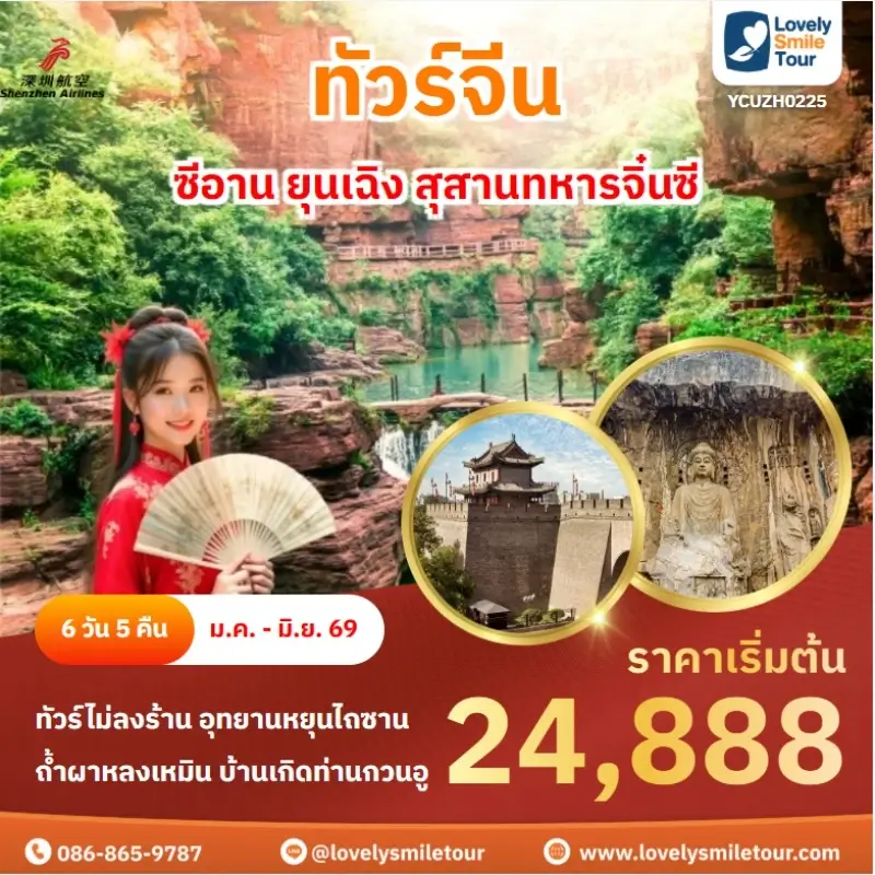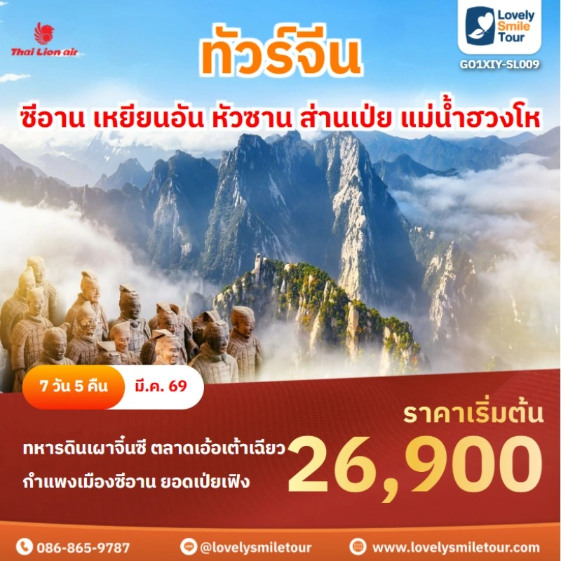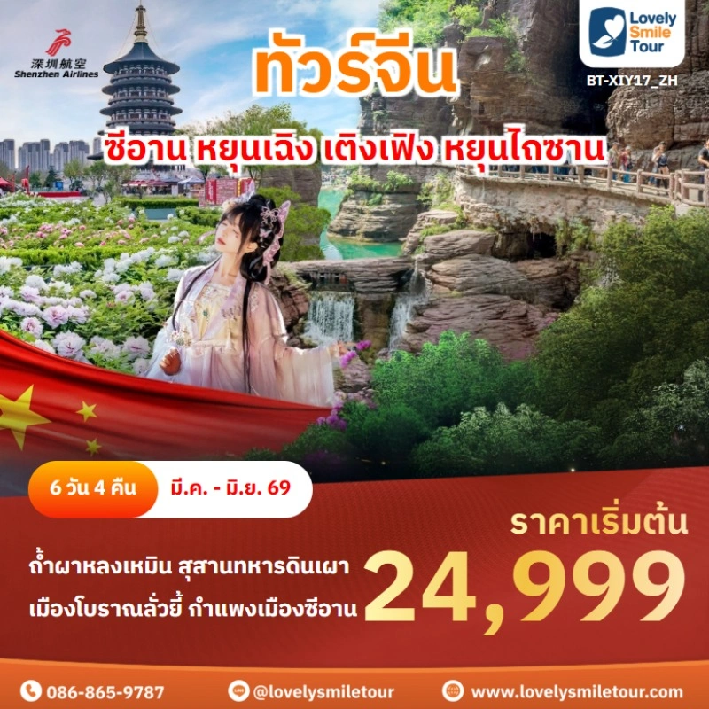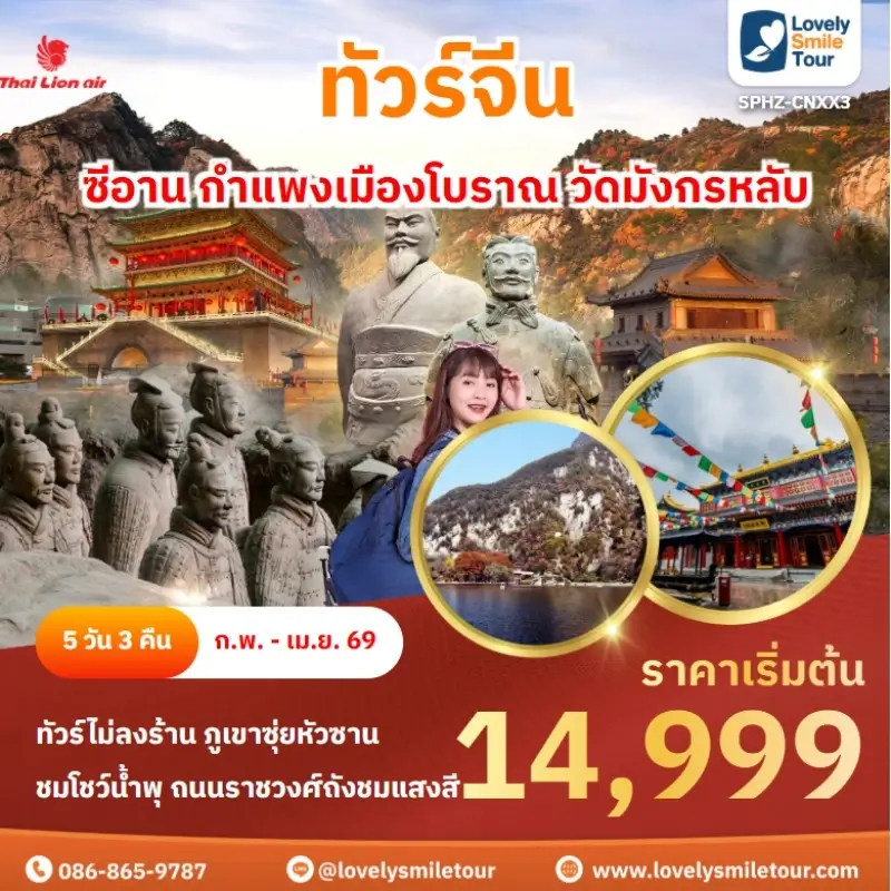 Lovely Smile Tour มีแพ็กเกจ ทัวร์ซีอาน ให้เลือกหลายรูปแบบ มีทั้งแบบไม่เข้าร้านรัฐบาลและแบบเข้าร้านรัฐบาล พักโรงแรมระดับ 4-5 ดาว สายการบินมีทั้งแบบ Full Service และ Low Cost หากสนใจจองแพ็กเกจไหน แอดไลน์หรือโทรสอบถามได้เลย