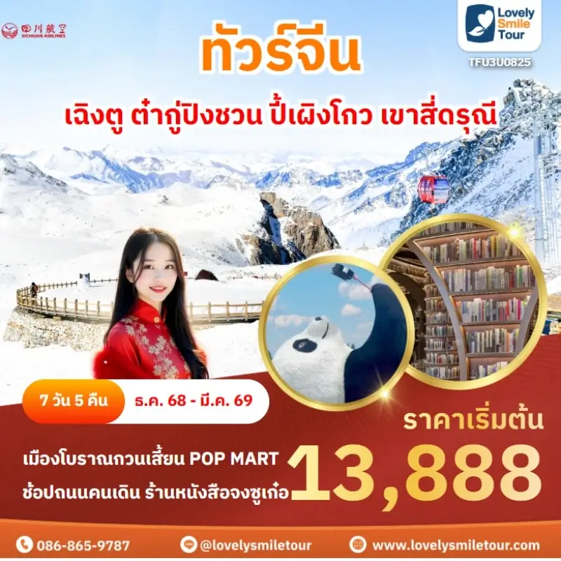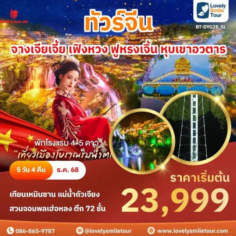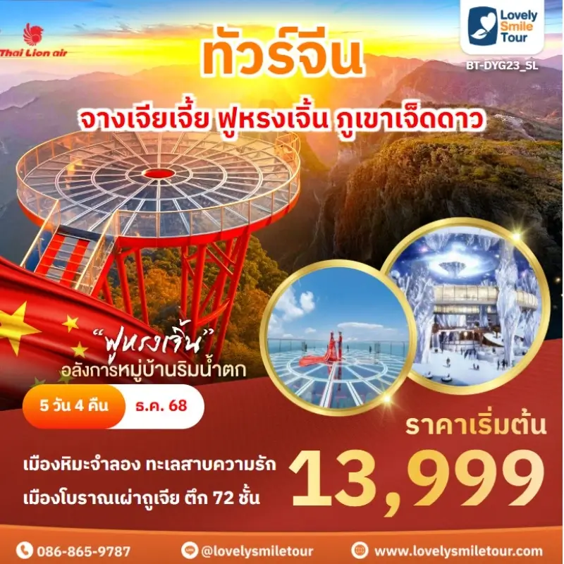 Lovely Smile Tour มีแพ็กเกจ ทัวร์จีน ให้เลือกหลายรูปแบบ หลากหลายเมือง อาทิเช่น กำแพงเมืองจีน จางเจียเจี้ย คุณหมิง ต้าหลี่ ลี่เจียง แชงกรีล่า เซี่ยงไฮ้ ปักกิ่ง ฉงชิ่ง ที่สำคัญมีแบบไม่เข้าร้านรัฐบาลด้วย หรือถ้าชอบทัวร์จีน ราคาถูก หรือแบบ 5 ดาว ก็มีเช่นกัน นอกจากนี้ โปรแกรมทัวร์จะแตกต่างกันในเรื่องสายการบิน ระดับโรงแรม ร้านอาหารมื้อพิเศษ สนใจจองแพ็กเกจไหน แอดไลน์หรือโทรสอบถามได้เลย
