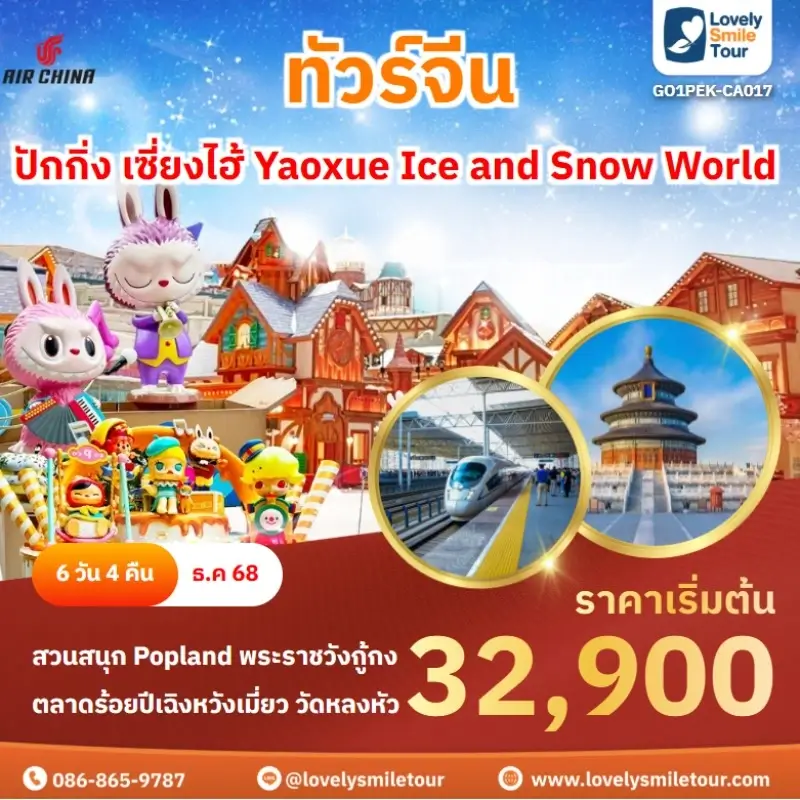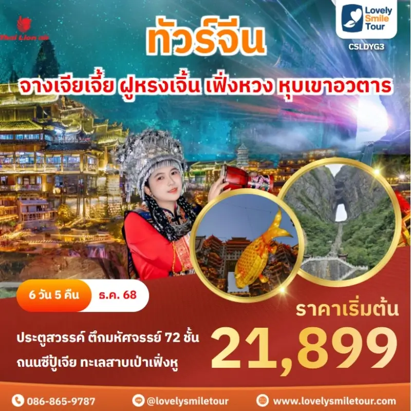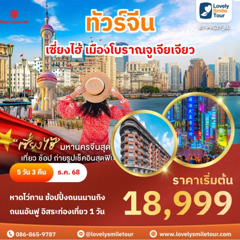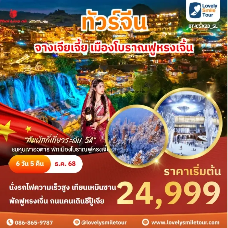 Lovely Smile Tour มีแพ็กเกจ ทัวร์จีน ให้เลือกหลายรูปแบบ หลากหลายเมือง อาทิเช่น กำแพงเมืองจีน จางเจียเจี้ย คุณหมิง ต้าหลี่ ลี่เจียง แชงกรีล่า เซี่ยงไฮ้ ปักกิ่ง ฉงชิ่ง ที่สำคัญมีแบบไม่เข้าร้านรัฐบาลด้วย หรือถ้าชอบทัวร์จีน ราคาถูก หรือแบบ 5 ดาว ก็มีเช่นกัน นอกจากนี้ โปรแกรมทัวร์จะแตกต่างกันในเรื่องสายการบิน ระดับโรงแรม ร้านอาหารมื้อพิเศษ สนใจจองแพ็กเกจไหน แอดไลน์หรือโทรสอบถามได้เลย
