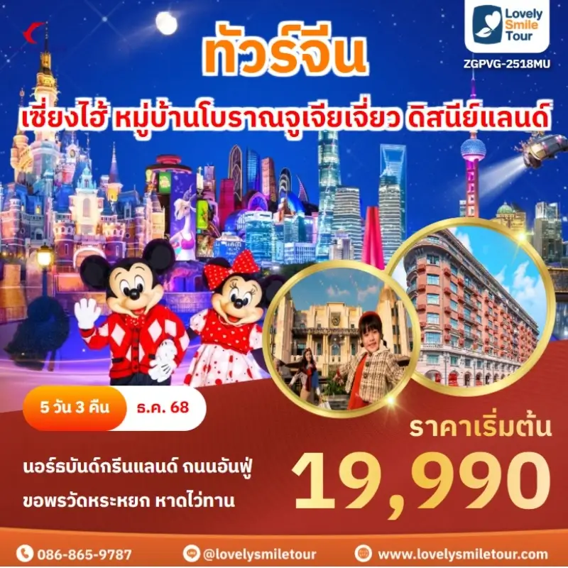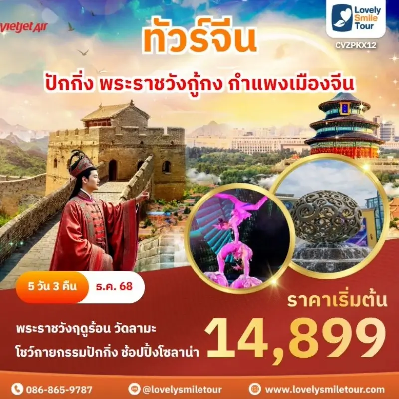 Lovely Smile Tour มีแพ็กเกจ ทัวร์จีน ให้เลือกหลายรูปแบบ หลากหลายเมือง อาทิเช่น กำแพงเมืองจีน จางเจียเจี้ย คุณหมิง ต้าหลี่ ลี่เจียง แชงกรีล่า เซี่ยงไฮ้ ปักกิ่ง ฉงชิ่ง ที่สำคัญมีแบบไม่เข้าร้านรัฐบาลด้วย หรือถ้าชอบทัวร์จีน ราคาถูก หรือแบบ 5 ดาว ก็มีเช่นกัน นอกจากนี้ โปรแกรมทัวร์จะแตกต่างกันในเรื่องสายการบิน ระดับโรงแรม ร้านอาหารมื้อพิเศษ สนใจจองแพ็กเกจไหน แอดไลน์หรือโทรสอบถามได้เลย