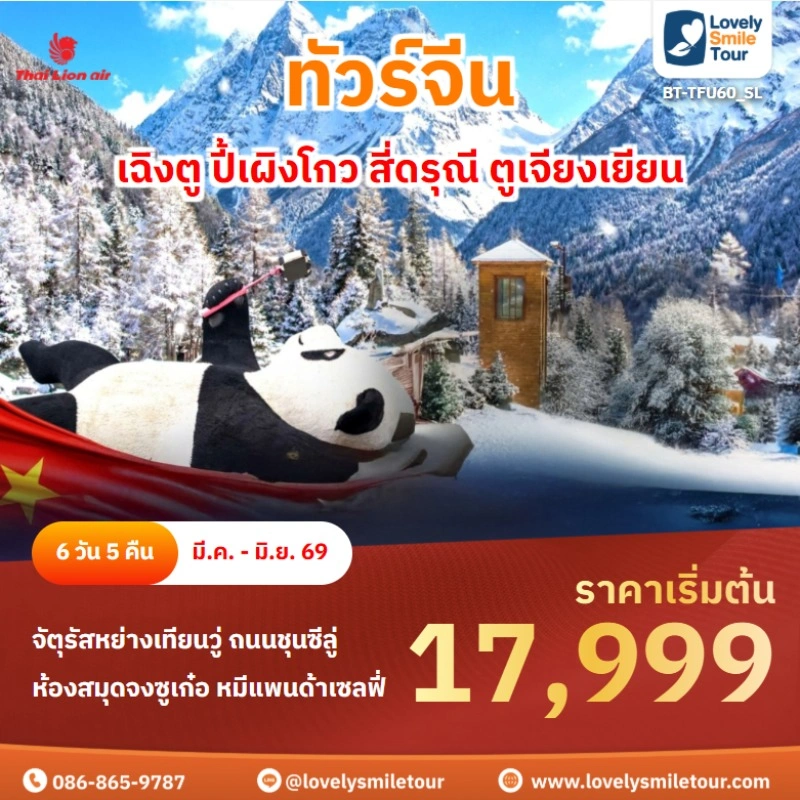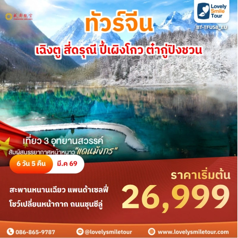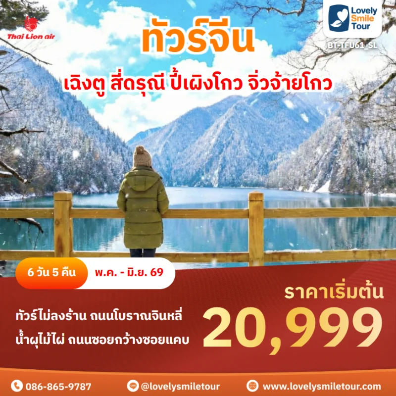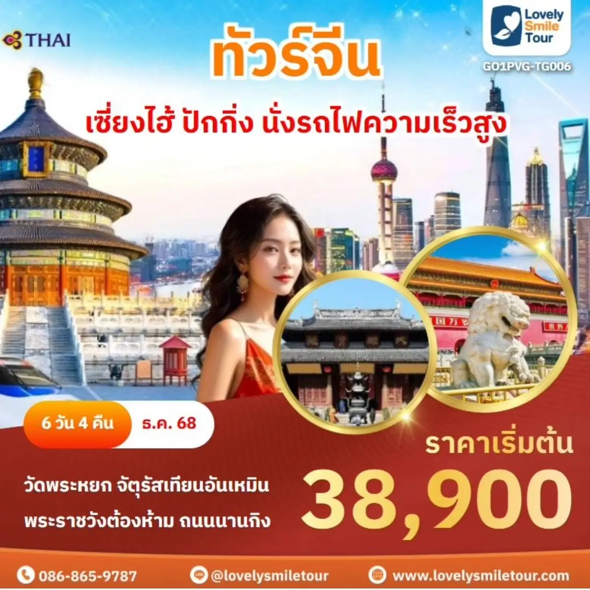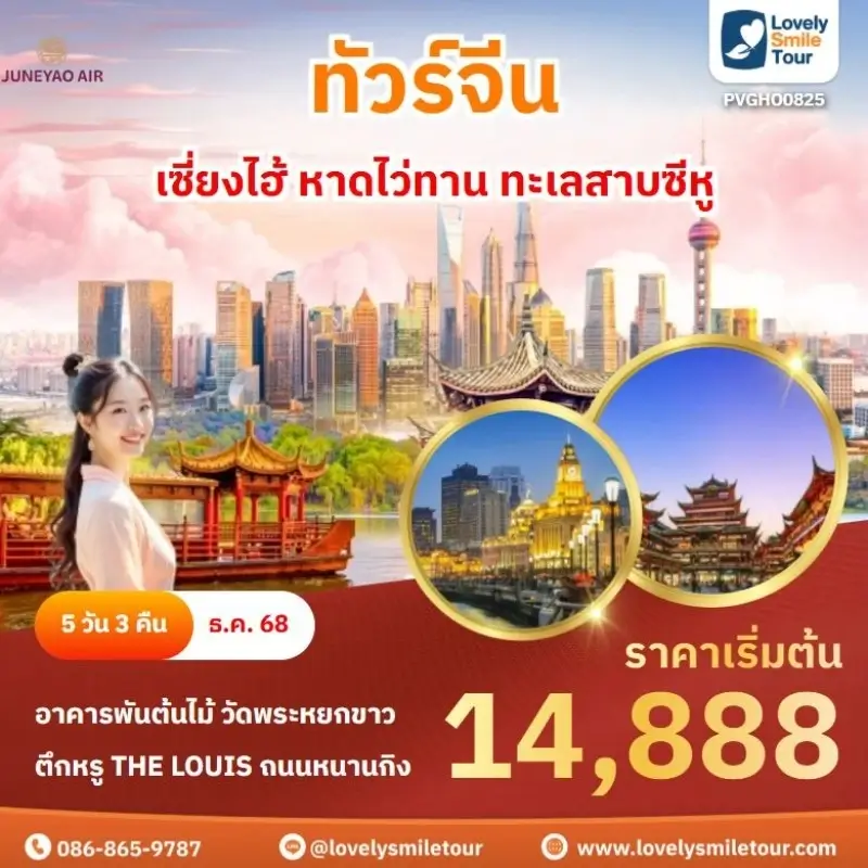 Lovely Smile Tour มีแพ็กเกจ ทัวร์จีน ให้เลือกหลายรูปแบบ หลากหลายเมือง อาทิเช่น กำแพงเมืองจีน จางเจียเจี้ย คุณหมิง ต้าหลี่ ลี่เจียง แชงกรีล่า เซี่ยงไฮ้ ปักกิ่ง ฉงชิ่ง ที่สำคัญมีแบบไม่เข้าร้านรัฐบาลด้วย หรือถ้าชอบทัวร์จีน ราคาถูก หรือแบบ 5 ดาว ก็มีเช่นกัน นอกจากนี้ โปรแกรมทัวร์จะแตกต่างกันในเรื่องสายการบิน ระดับโรงแรม ร้านอาหารมื้อพิเศษ สนใจจองแพ็กเกจไหน แอดไลน์หรือโทรสอบถามได้เลย