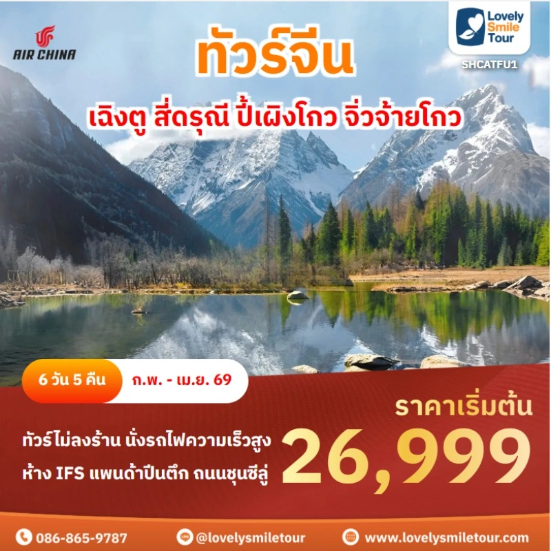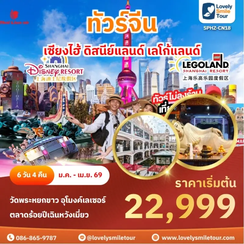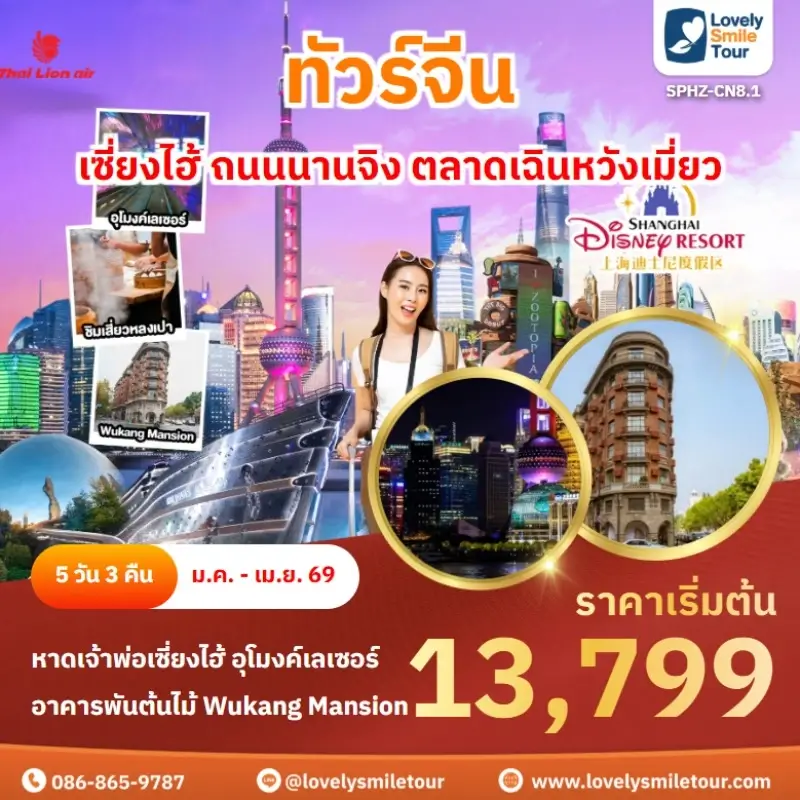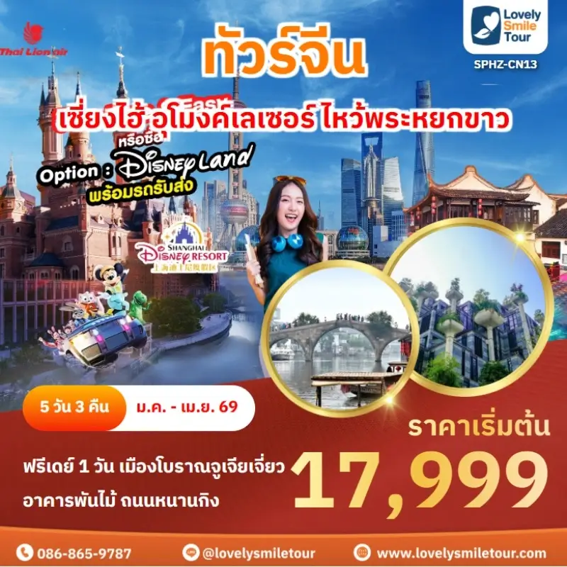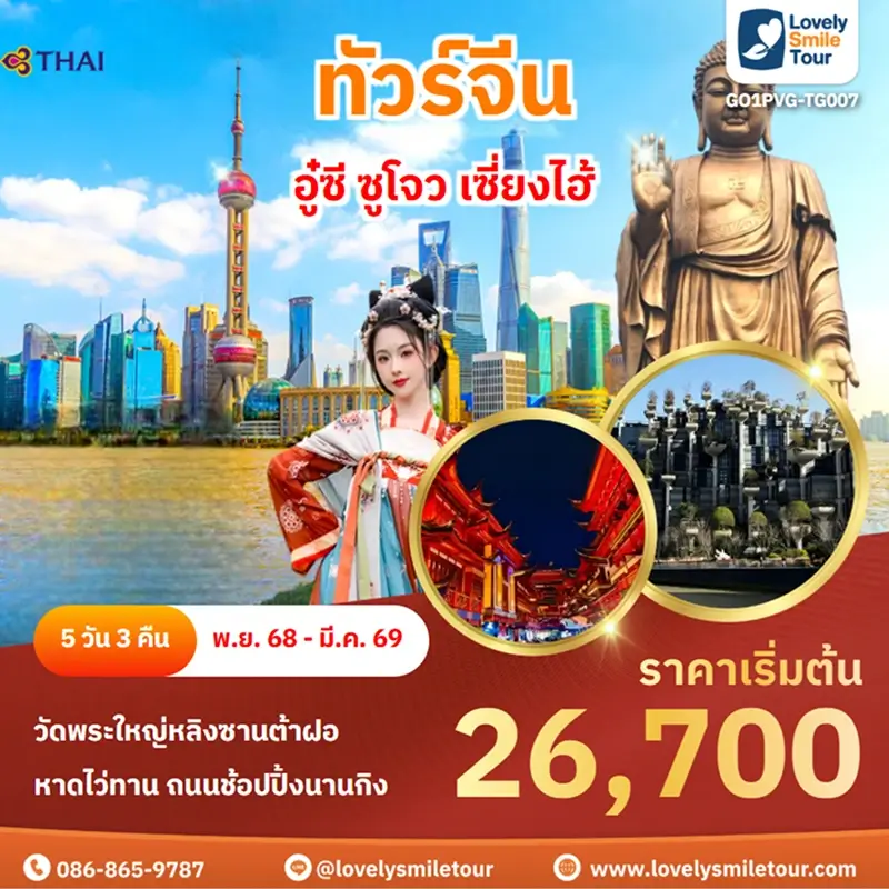 Lovely Smile Tour มีแพ็กเกจ ทัวร์จีน ให้เลือกหลายรูปแบบ หลากหลายเมือง อาทิเช่น กำแพงเมืองจีน จางเจียเจี้ย คุณหมิง ต้าหลี่ ลี่เจียง แชงกรีล่า เซี่ยงไฮ้ ปักกิ่ง ฉงชิ่ง ที่สำคัญมีแบบไม่เข้าร้านรัฐบาลด้วย หรือถ้าชอบทัวร์จีน ราคาถูก หรือแบบ 5 ดาว ก็มีเช่นกัน นอกจากนี้ โปรแกรมทัวร์จะแตกต่างกันในเรื่องสายการบิน ระดับโรงแรม ร้านอาหารมื้อพิเศษ สนใจจองแพ็กเกจไหน แอดไลน์หรือโทรสอบถามได้เลย