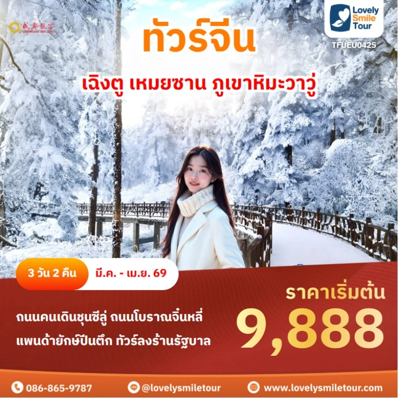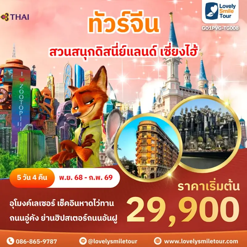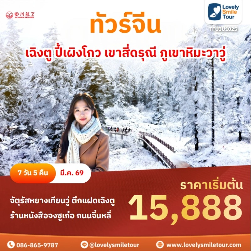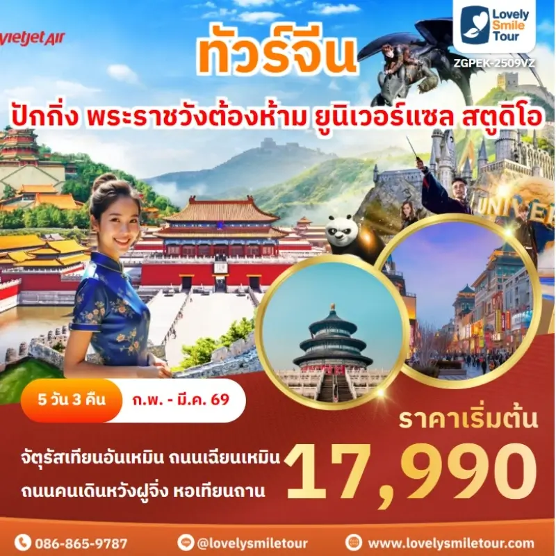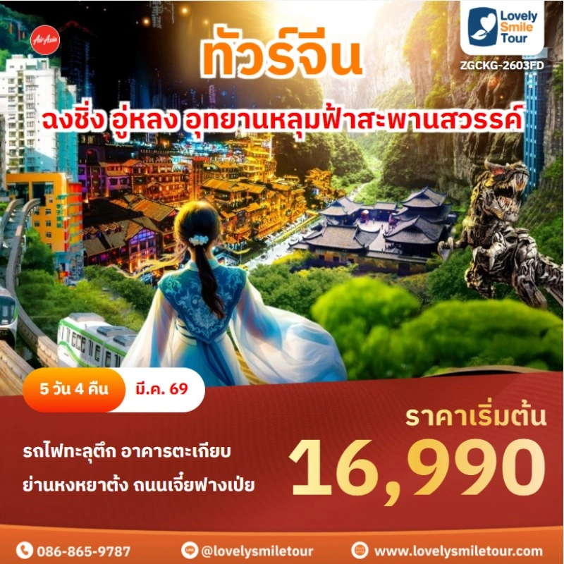 Lovely Smile Tour มีแพ็กเกจ ทัวร์จีน ให้เลือกหลายรูปแบบ หลากหลายเมือง อาทิเช่น กำแพงเมืองจีน จางเจียเจี้ย คุณหมิง ต้าหลี่ ลี่เจียง แชงกรีล่า เซี่ยงไฮ้ ปักกิ่ง ฉงชิ่ง ที่สำคัญมีแบบไม่เข้าร้านรัฐบาลด้วย หรือถ้าชอบทัวร์จีน ราคาถูก หรือแบบ 5 ดาว ก็มีเช่นกัน นอกจากนี้ โปรแกรมทัวร์จะแตกต่างกันในเรื่องสายการบิน ระดับโรงแรม ร้านอาหารมื้อพิเศษ สนใจจองแพ็กเกจไหน แอดไลน์หรือโทรสอบถามได้เลย