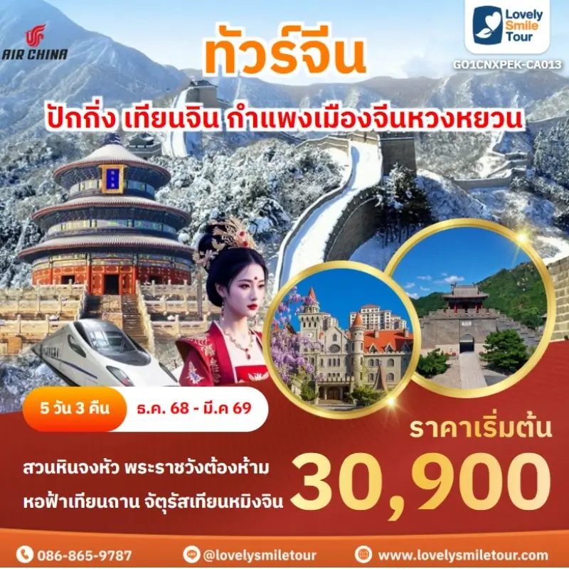 Lovely Smile Tour มีแพ็กเกจ ทัวร์จีน ให้เลือกหลายรูปแบบ หลากหลายเมือง อาทิเช่น กำแพงเมืองจีน จางเจียเจี้ย คุณหมิง ต้าหลี่ ลี่เจียง แชงกรีล่า เซี่ยงไฮ้ ปักกิ่ง ฉงชิ่ง ที่สำคัญมีแบบไม่เข้าร้านรัฐบาลด้วย หรือถ้าชอบทัวร์จีน ราคาถูก หรือแบบ 5 ดาว ก็มีเช่นกัน นอกจากนี้ โปรแกรมทัวร์จะแตกต่างกันในเรื่องสายการบิน ระดับโรงแรม ร้านอาหารมื้อพิเศษ สนใจจองแพ็กเกจไหน แอดไลน์หรือโทรสอบถามได้เลย