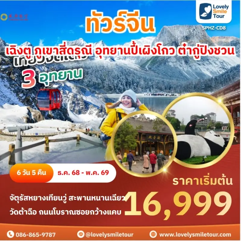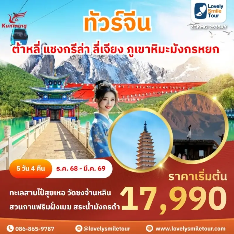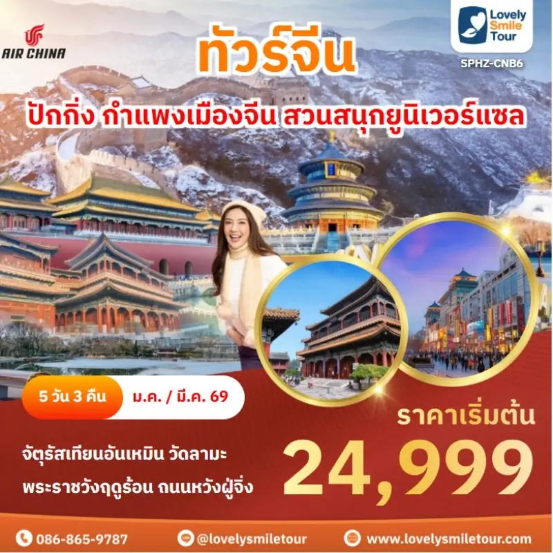 Lovely Smile Tour มีแพ็กเกจ ทัวร์จีน ให้เลือกหลายรูปแบบ หลากหลายเมือง อาทิเช่น กำแพงเมืองจีน จางเจียเจี้ย คุณหมิง ต้าหลี่ ลี่เจียง แชงกรีล่า เซี่ยงไฮ้ ปักกิ่ง ฉงชิ่ง ที่สำคัญมีแบบไม่เข้าร้านรัฐบาลด้วย หรือถ้าชอบทัวร์จีน ราคาถูก หรือแบบ 5 ดาว ก็มีเช่นกัน นอกจากนี้ โปรแกรมทัวร์จะแตกต่างกันในเรื่องสายการบิน ระดับโรงแรม ร้านอาหารมื้อพิเศษ สนใจจองแพ็กเกจไหน แอดไลน์หรือโทรสอบถามได้เลย