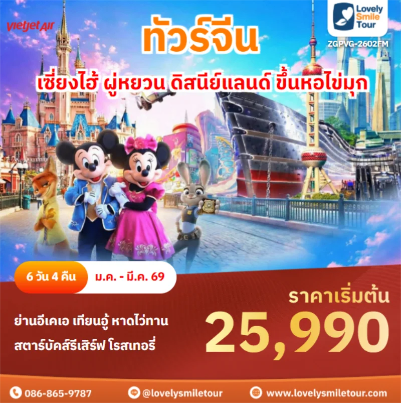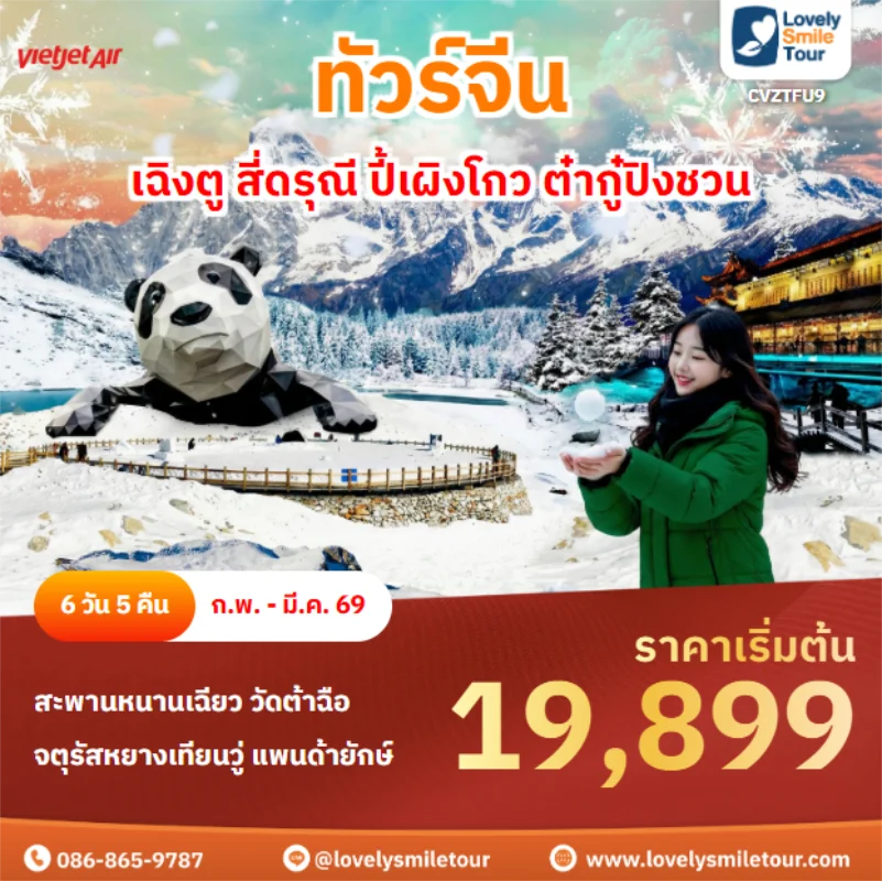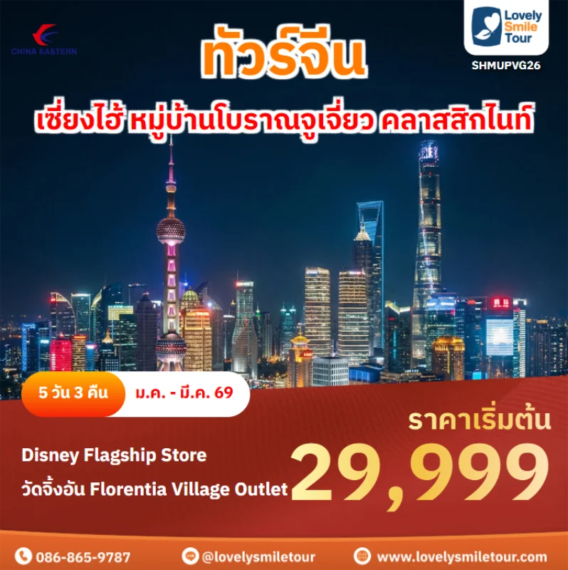 Lovely Smile Tour มีแพ็กเกจ ทัวร์จีน ให้เลือกหลายรูปแบบ หลากหลายเมือง อาทิเช่น กำแพงเมืองจีน จางเจียเจี้ย คุณหมิง ต้าหลี่ ลี่เจียง แชงกรีล่า เซี่ยงไฮ้ ปักกิ่ง ฉงชิ่ง ที่สำคัญมีแบบไม่เข้าร้านรัฐบาลด้วย หรือถ้าชอบทัวร์จีน ราคาถูก หรือแบบ 5 ดาว ก็มีเช่นกัน นอกจากนี้ โปรแกรมทัวร์จะแตกต่างกันในเรื่องสายการบิน ระดับโรงแรม ร้านอาหารมื้อพิเศษ สนใจจองแพ็กเกจไหน แอดไลน์หรือโทรสอบถามได้เลย