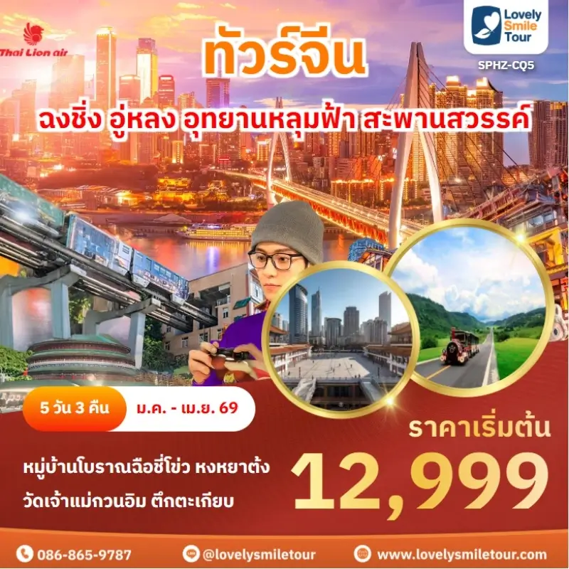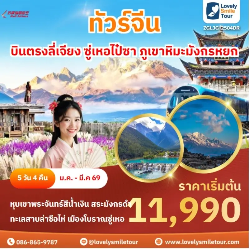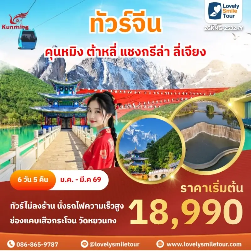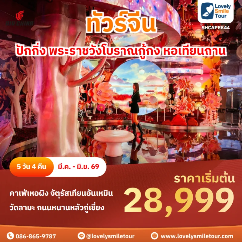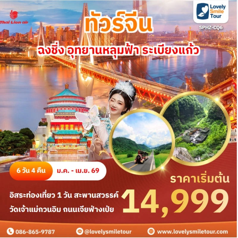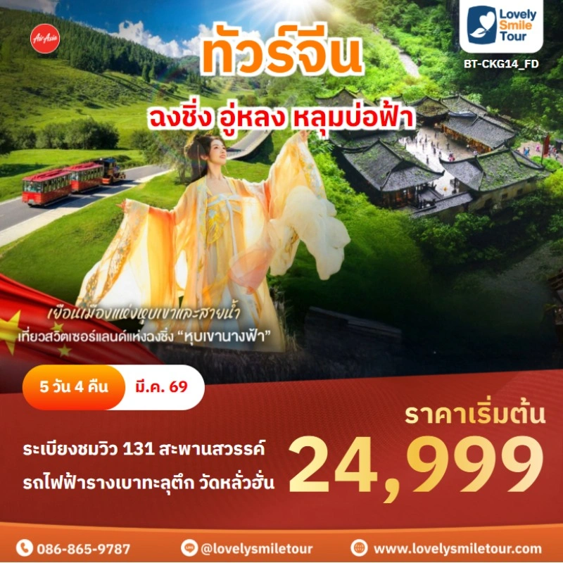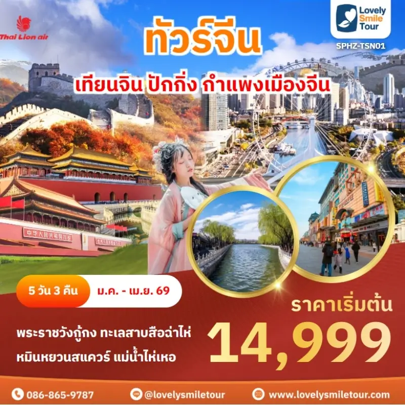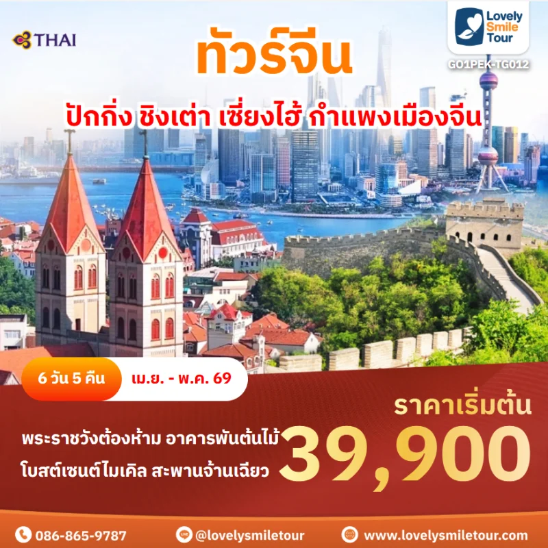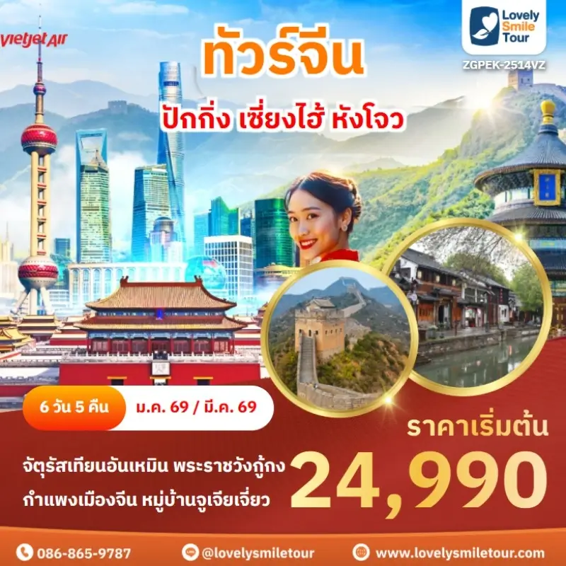 Lovely Smile Tour มีแพ็กเกจ ทัวร์จีน ให้เลือกหลายรูปแบบ หลากหลายเมือง อาทิเช่น กำแพงเมืองจีน จางเจียเจี้ย คุณหมิง ต้าหลี่ ลี่เจียง แชงกรีล่า เซี่ยงไฮ้ ปักกิ่ง ฉงชิ่ง ที่สำคัญมีแบบไม่เข้าร้านรัฐบาลด้วย หรือถ้าชอบทัวร์จีน ราคาถูก หรือแบบ 5 ดาว ก็มีเช่นกัน นอกจากนี้ โปรแกรมทัวร์จะแตกต่างกันในเรื่องสายการบิน ระดับโรงแรม ร้านอาหารมื้อพิเศษ สนใจจองแพ็กเกจไหน แอดไลน์หรือโทรสอบถามได้เลย