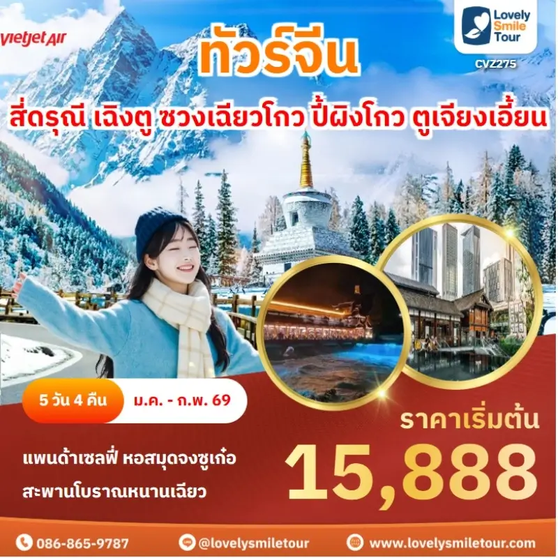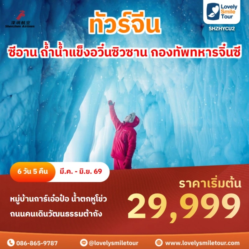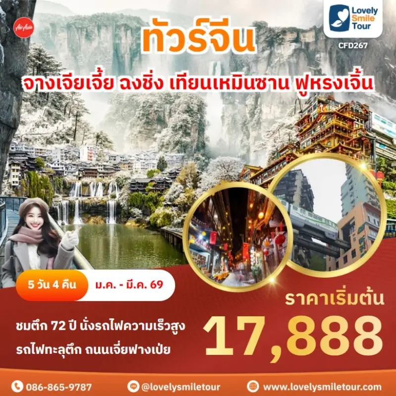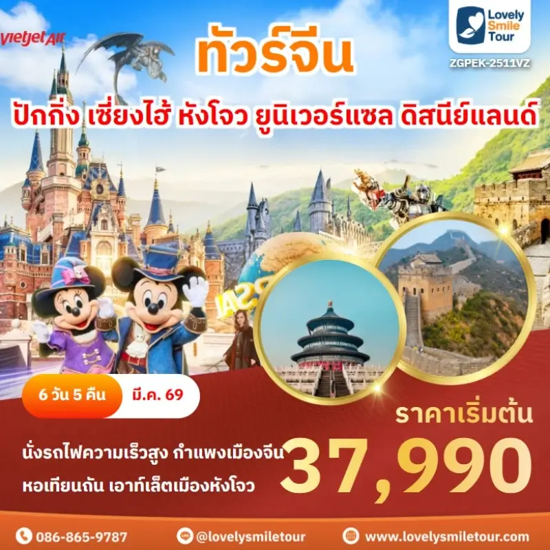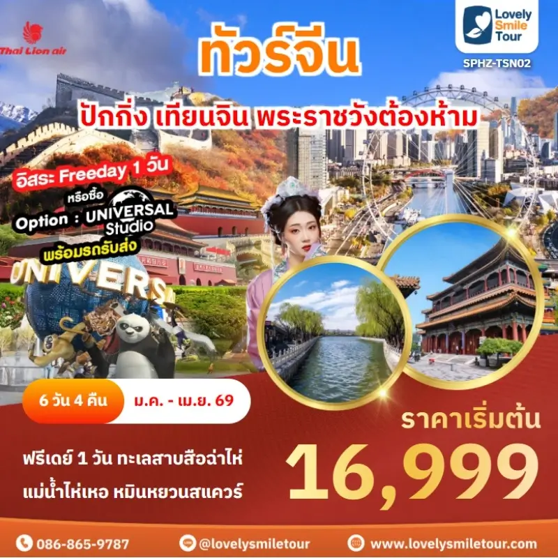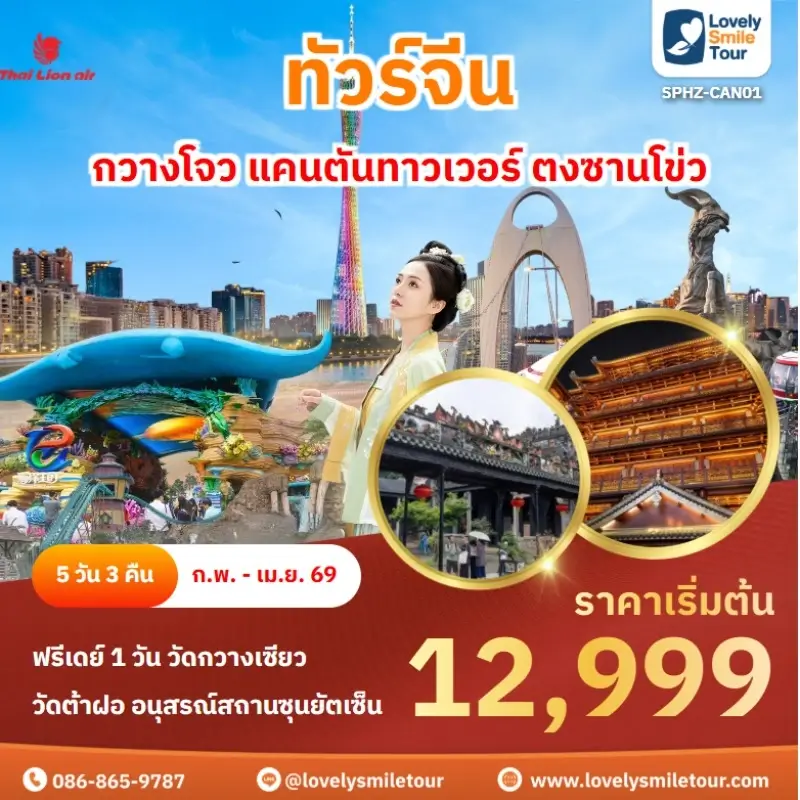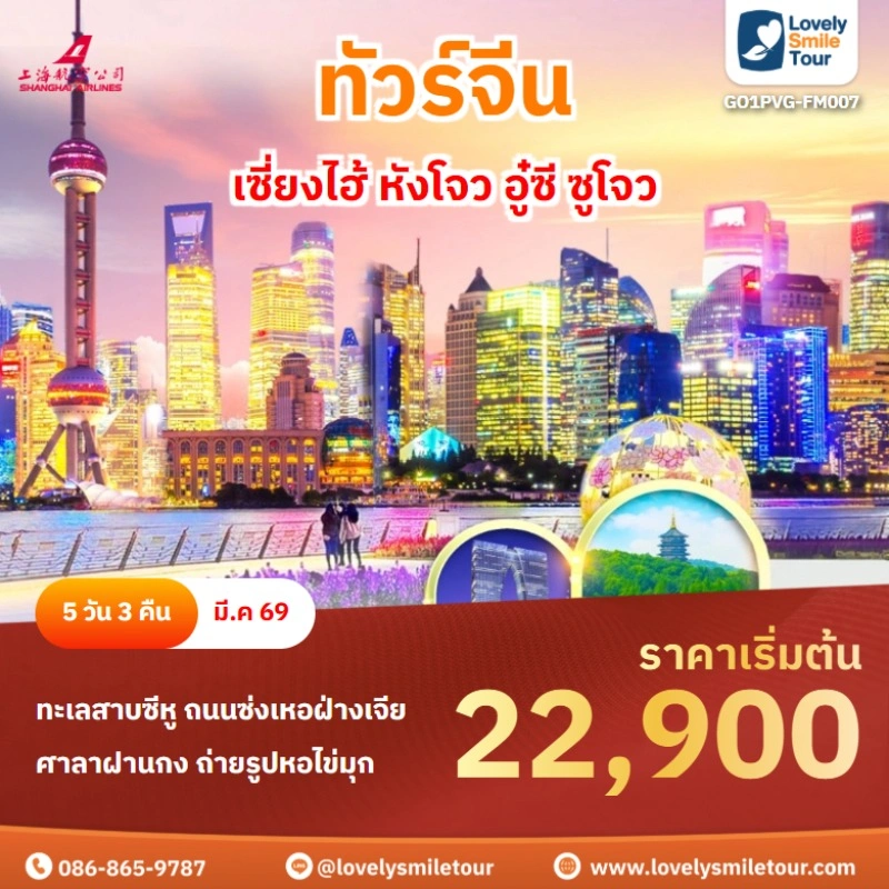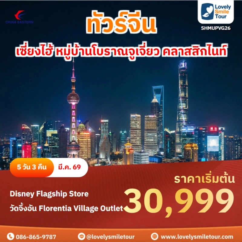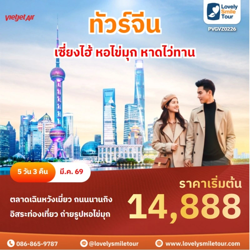 Lovely Smile Tour มีแพ็กเกจ ทัวร์จีน ให้เลือกหลายรูปแบบ หลากหลายเมือง อาทิเช่น กำแพงเมืองจีน จางเจียเจี้ย คุณหมิง ต้าหลี่ ลี่เจียง แชงกรีล่า เซี่ยงไฮ้ ปักกิ่ง ฉงชิ่ง ที่สำคัญมีแบบไม่เข้าร้านรัฐบาลด้วย หรือถ้าชอบทัวร์จีน ราคาถูก หรือแบบ 5 ดาว ก็มีเช่นกัน นอกจากนี้ โปรแกรมทัวร์จะแตกต่างกันในเรื่องสายการบิน ระดับโรงแรม ร้านอาหารมื้อพิเศษ สนใจจองแพ็กเกจไหน แอดไลน์หรือโทรสอบถามได้เลย