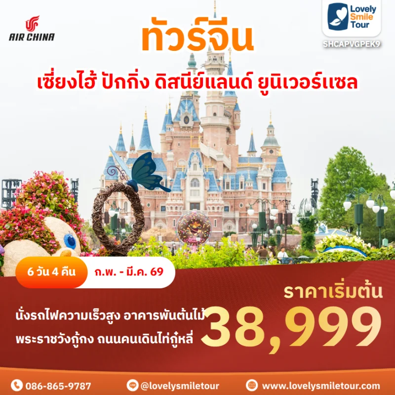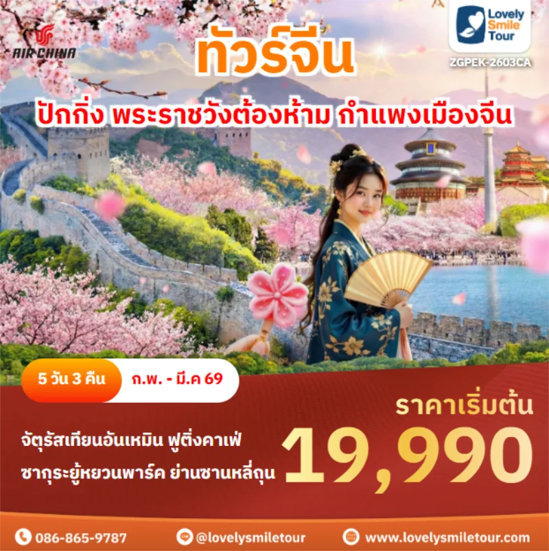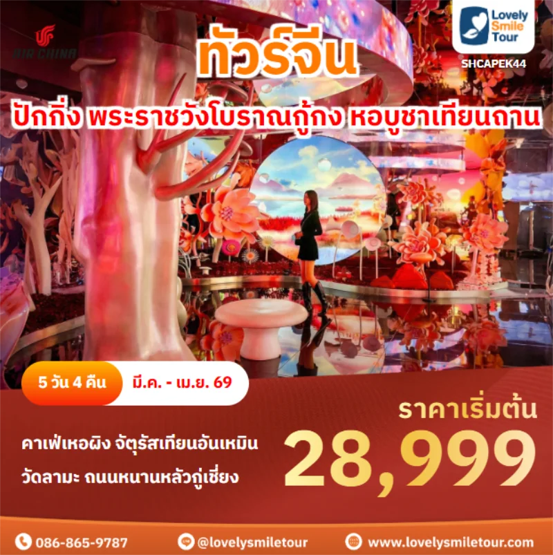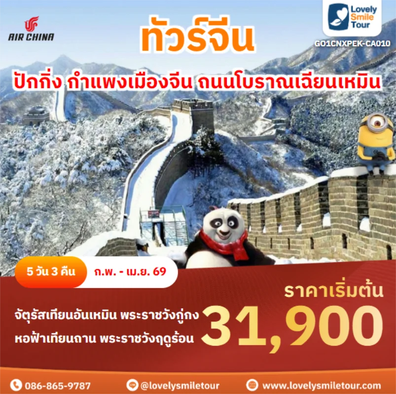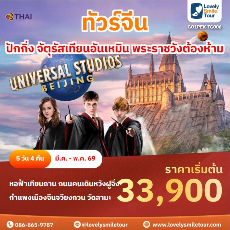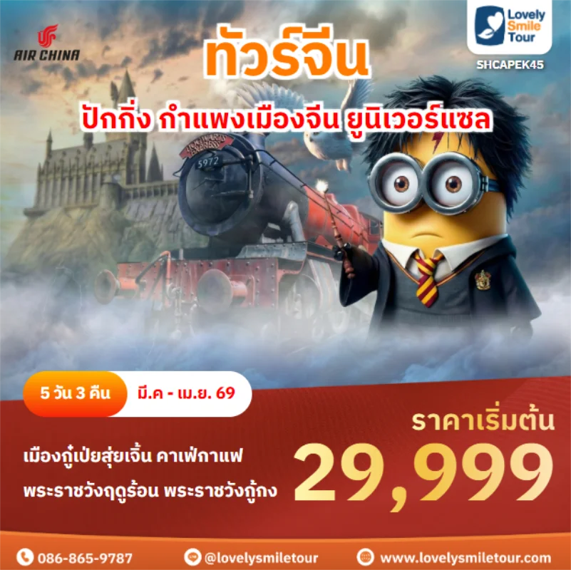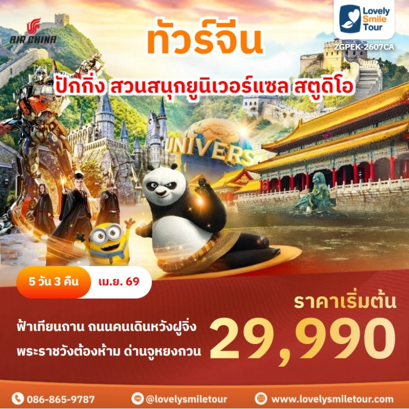 Lovely Smile Tour มีแพ็กเกจ ทัวร์ปักกิ่ง ให้เลือกหลายรูปแบบ มีทั้งแบบไม่เข้าร้านรัฐบาลและแบบเข้าร้านรัฐบาล แบบพาไปสวนสนุกยูนิเวอร์แซล สตูดิโอ ปักกิ่ง พักโรงแรมระดับ 4-5 ดาว สายการบินมีทั้งแบบ Full Service และ Low Cost หากสนใจจองแพ็กเกจไหน แอดไลน์หรือโทรสอบถามได้เลย