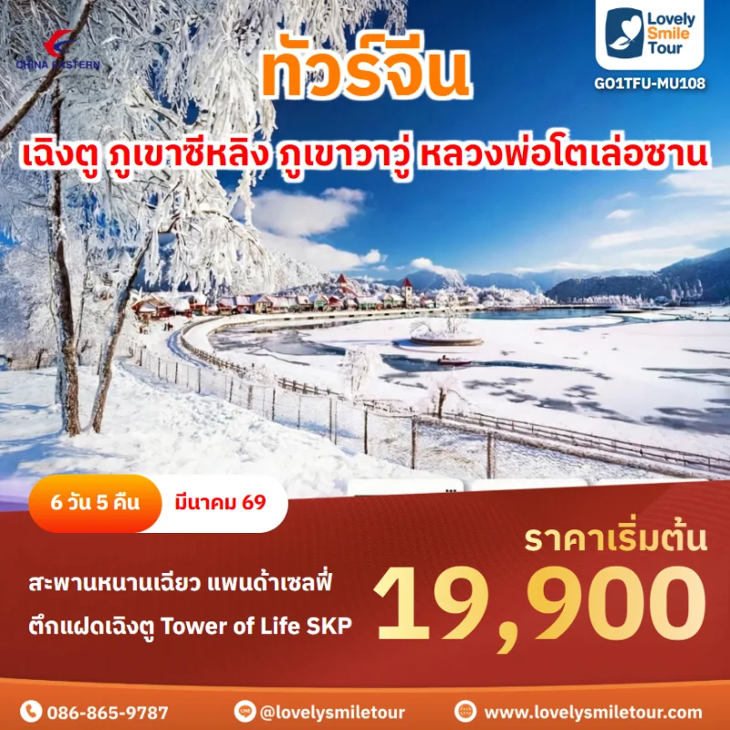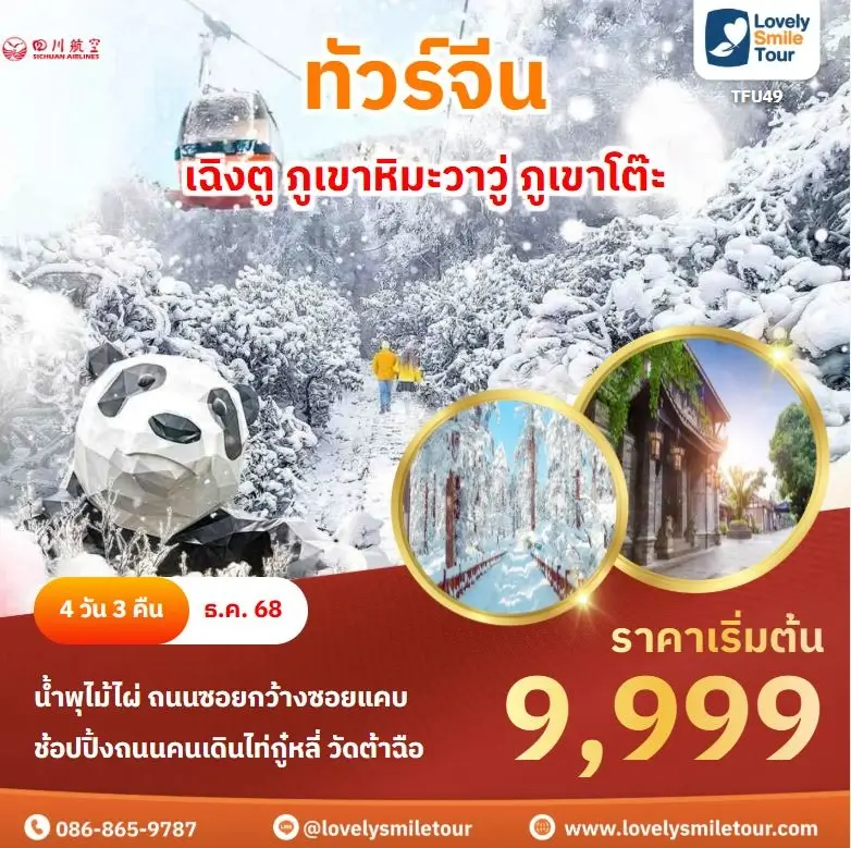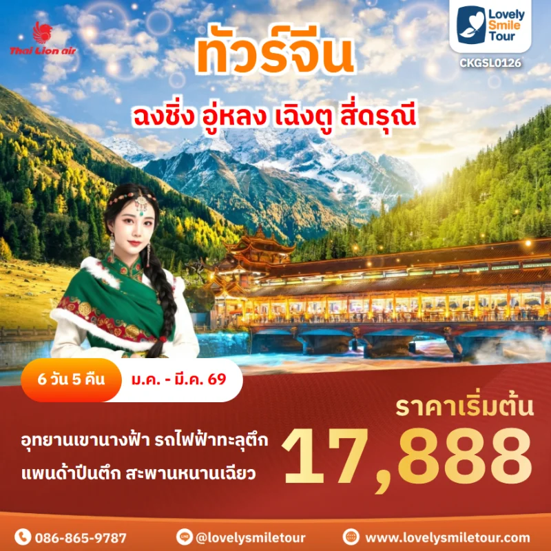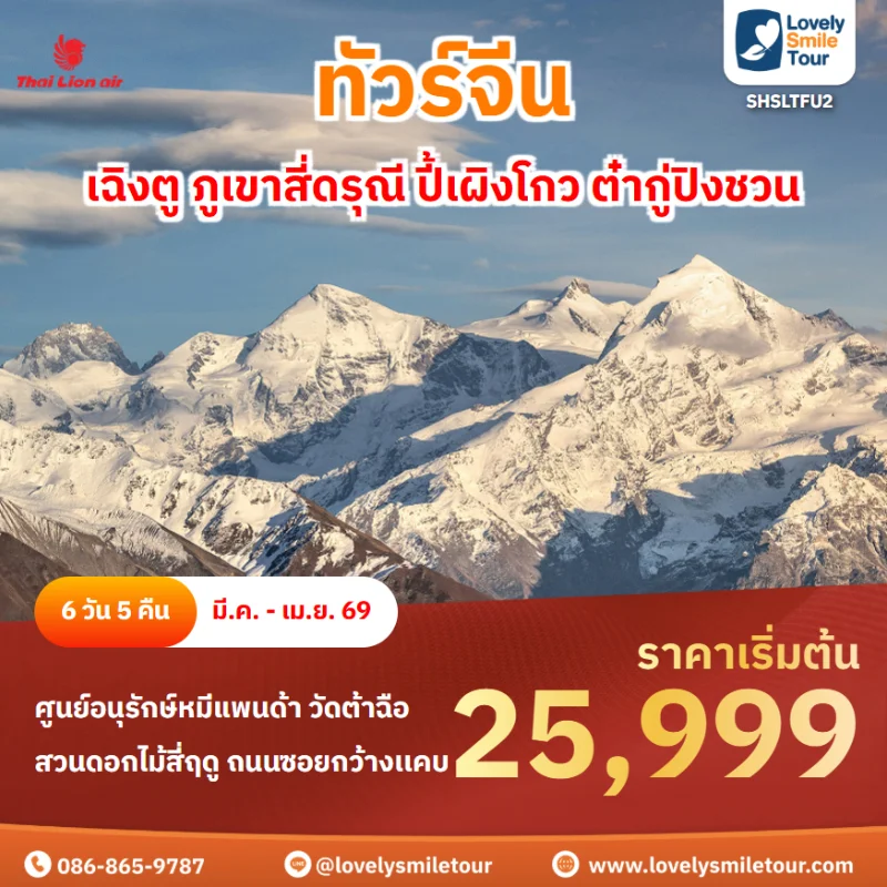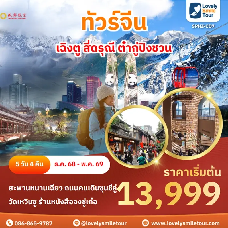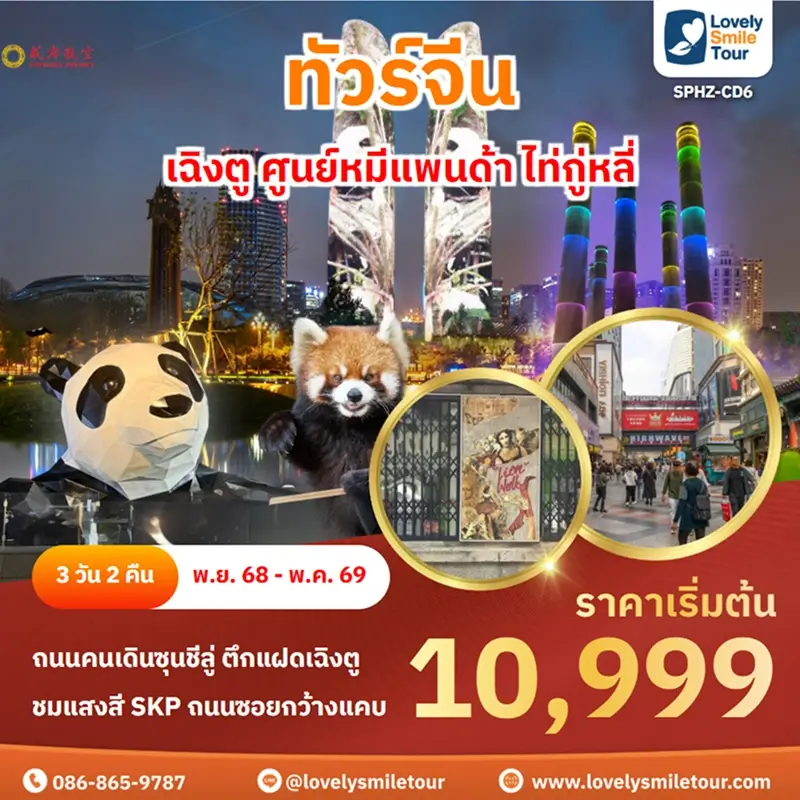 Lovely Smile Tour มีแพ็กเกจ ทัวร์เฉิงตู สี่ดรุณี หวงหลง จิ่วจ้ายโกว ให้เลือกหลายรูปแบบ มีทั้งแบบไม่เข้าร้านรัฐบาลและแบบเข้าร้านรัฐบาล พักโรงแรมระดับ 4-5 ดาว สายการบินมีทั้งแบบ Full Service และ Low Cost หากสนใจจองแพ็กเกจไหน แอดไลน์หรือโทรสอบถามได้เลย
