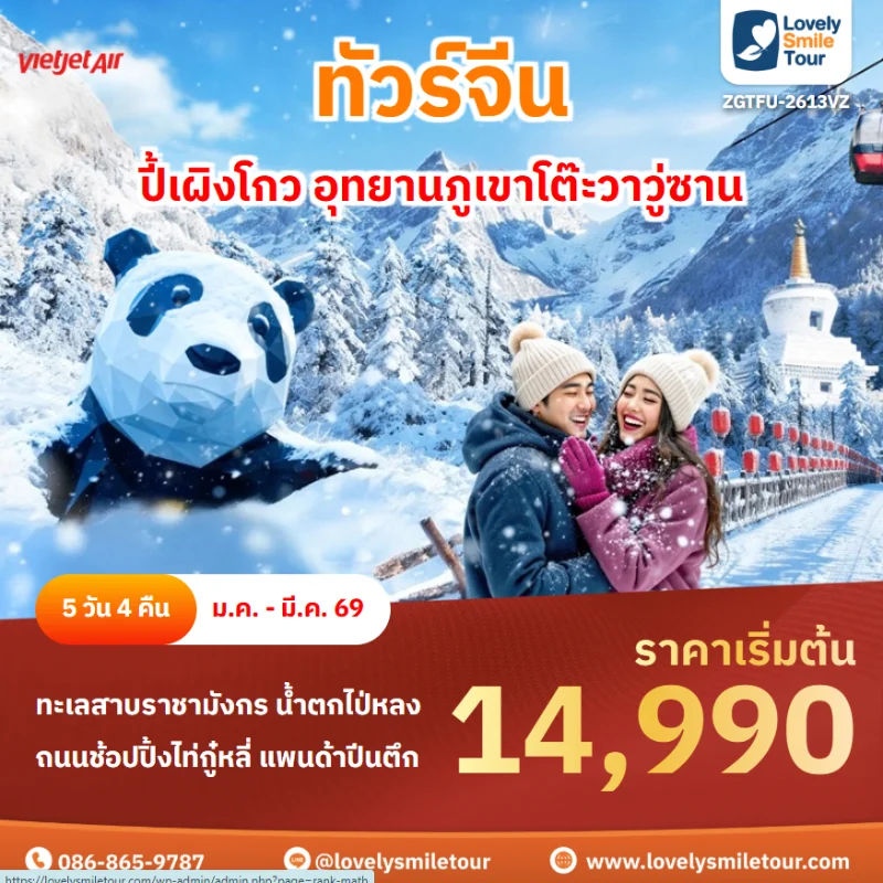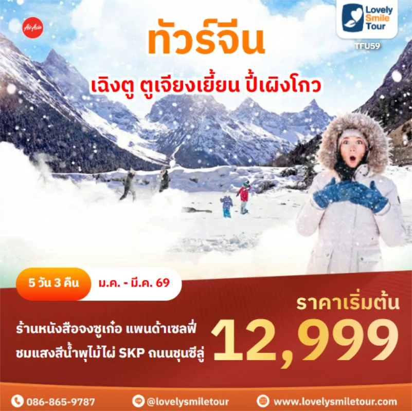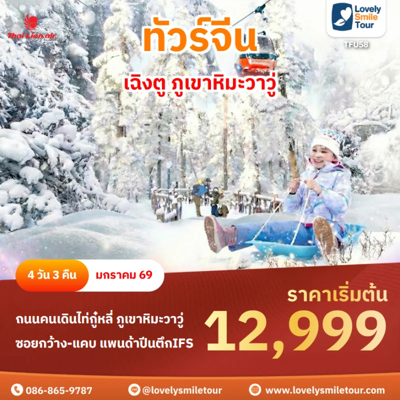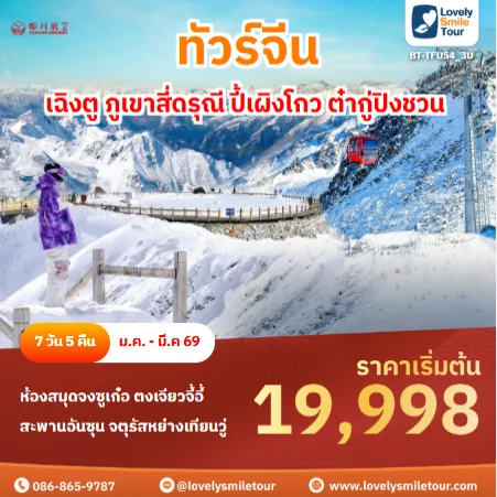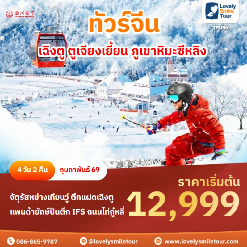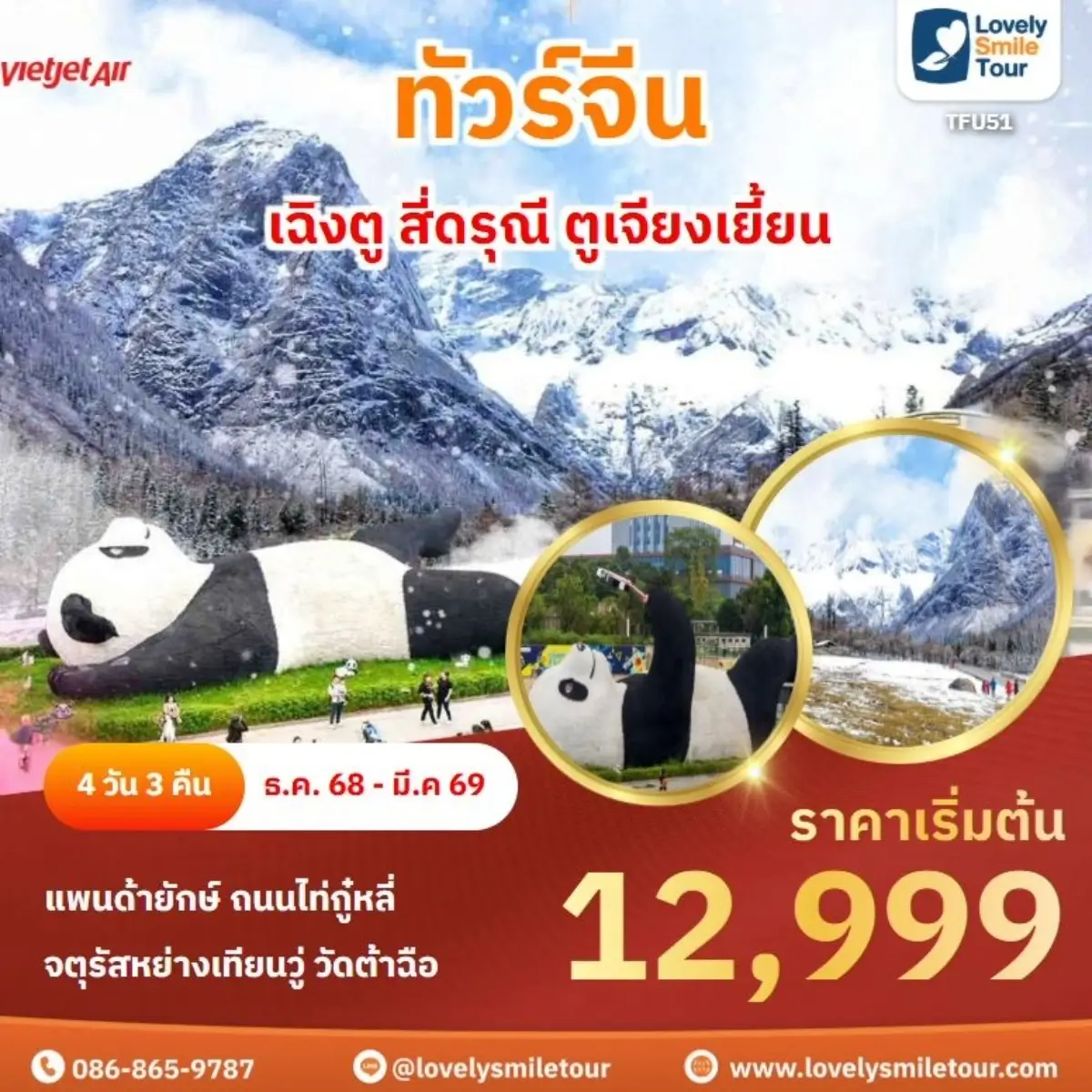 Lovely Smile Tour มีแพ็กเกจ ทัวร์เฉิงตู สี่ดรุณี หวงหลง จิ่วจ้ายโกว ให้เลือกหลายรูปแบบ มีทั้งแบบไม่เข้าร้านรัฐบาลและแบบเข้าร้านรัฐบาล พักโรงแรมระดับ 4-5 ดาว สายการบินมีทั้งแบบ Full Service และ Low Cost หากสนใจจองแพ็กเกจไหน แอดไลน์หรือโทรสอบถามได้เลย
