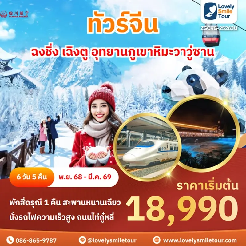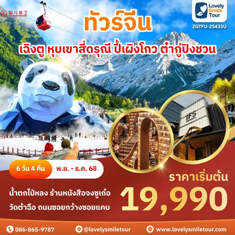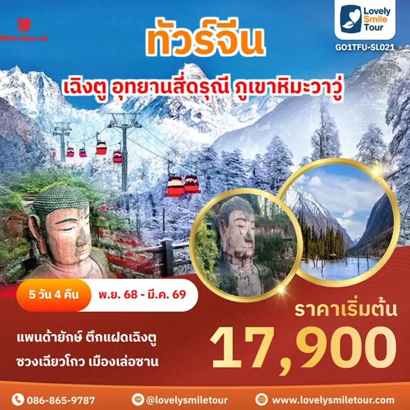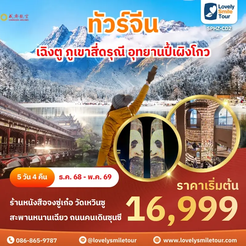 Lovely Smile Tour มีแพ็กเกจ ทัวร์เฉิงตู สี่ดรุณี หวงหลง จิ่วจ้ายโกว ให้เลือกหลายรูปแบบ มีทั้งแบบไม่เข้าร้านรัฐบาลและแบบเข้าร้านรัฐบาล พักโรงแรมระดับ 4-5 ดาว สายการบินมีทั้งแบบ Full Service และ Low Cost หากสนใจจองแพ็กเกจไหน แอดไลน์หรือโทรสอบถามได้เลย