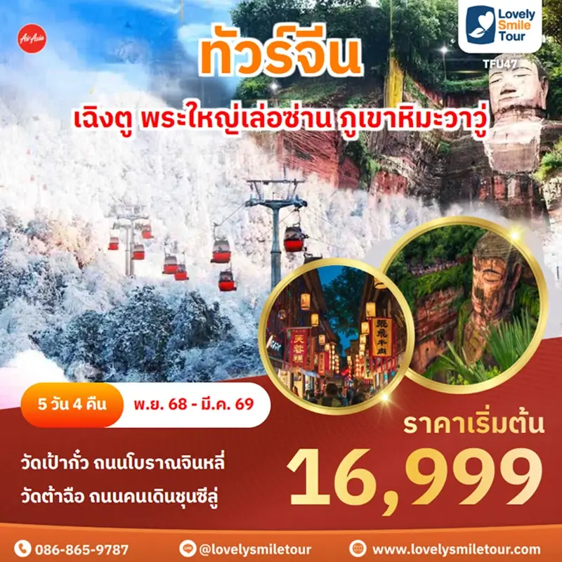 เฉิงตู เมืองเอกของมณฑลเสฉวน เต็มไปด้วยสถานที่ท่องเที่ยวที่หลากหลาย ทั้งทางวัฒนธรรม ธรรมชาติ และสัตว์ป่า ไม่ว่าจะเป็นการชมแพนด้ายักษ์ที่ศูนย์อนุรักษ์, เดินเล่นในย่านโบราณ ทำให้เฉิงตูจึงเหมาะสำหรับนักท่องเที่ยวที่ต้องการทั้งความผ่อนคลายและการผจญภัยในเวลาเดียวกัน หากคุณมองหาจุดหมายที่ผสมผสานความทันสมัยกับวัฒนธรรมจีนแท้ๆ ทัวร์เฉิงตูคือตัวเลือกที่ไม่ควรพลาด หากสนใจแพคเกจทัวร์ สามารถแอดไลน์สอบถามได้เลย LINE ID : @lovelysmiletour