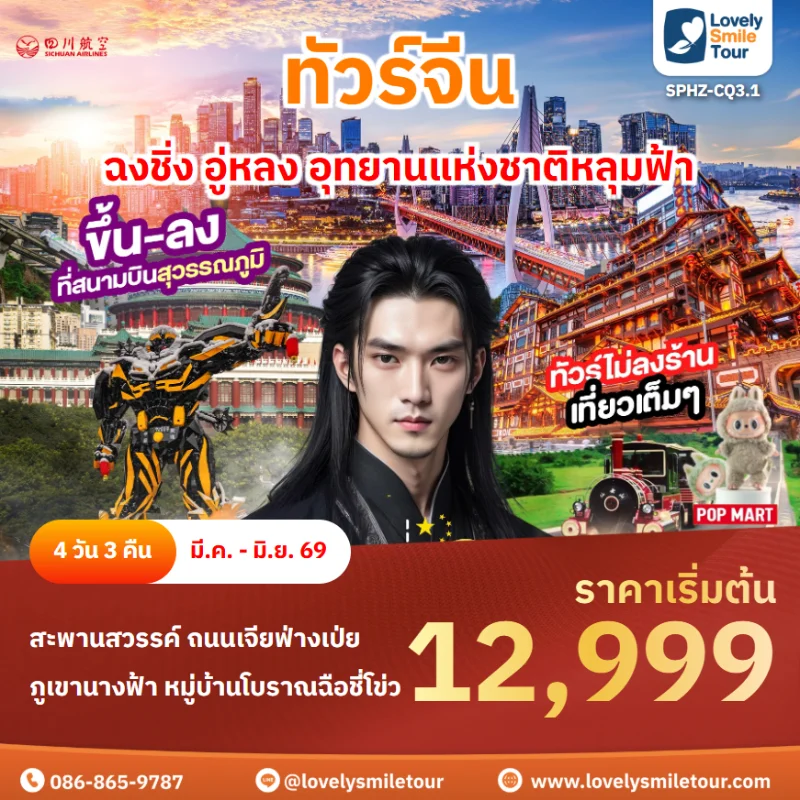 Lovely Smile Tour มีแพ็กเกจ ทัวร์ฉงชิ่ง ให้เลือกหลายรูปแบบ มีทั้งแบบไม่เข้าร้านรัฐบาลและแบบเข้าร้านรัฐบาล พักโรงแรมระดับ 4-5 ดาว สายการบินมีทั้งแบบ Full Service และ Low Cost หากสนใจจองแพ็กเกจไหน แอดไลน์หรือโทรสอบถามได้เลย