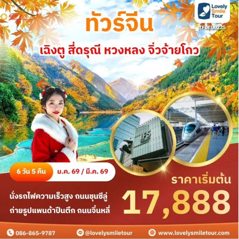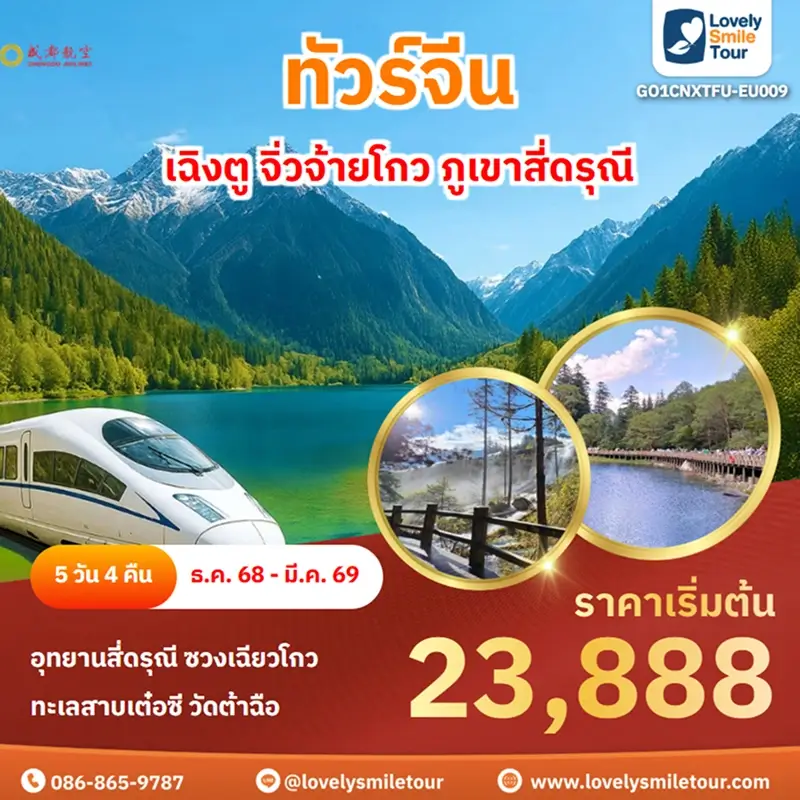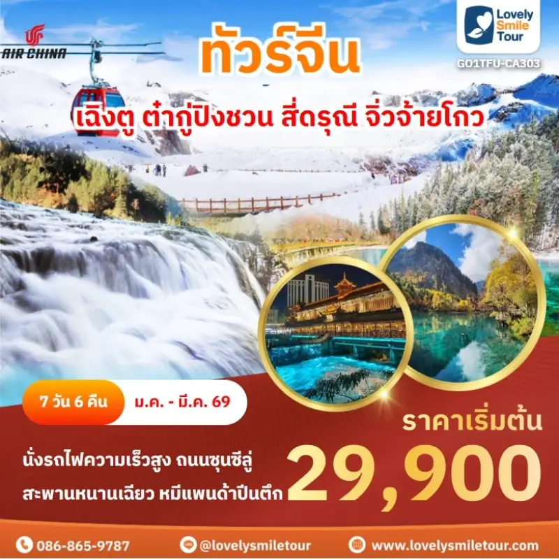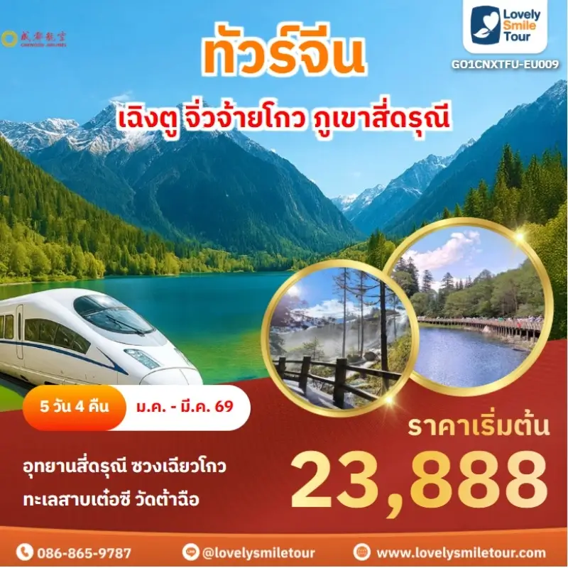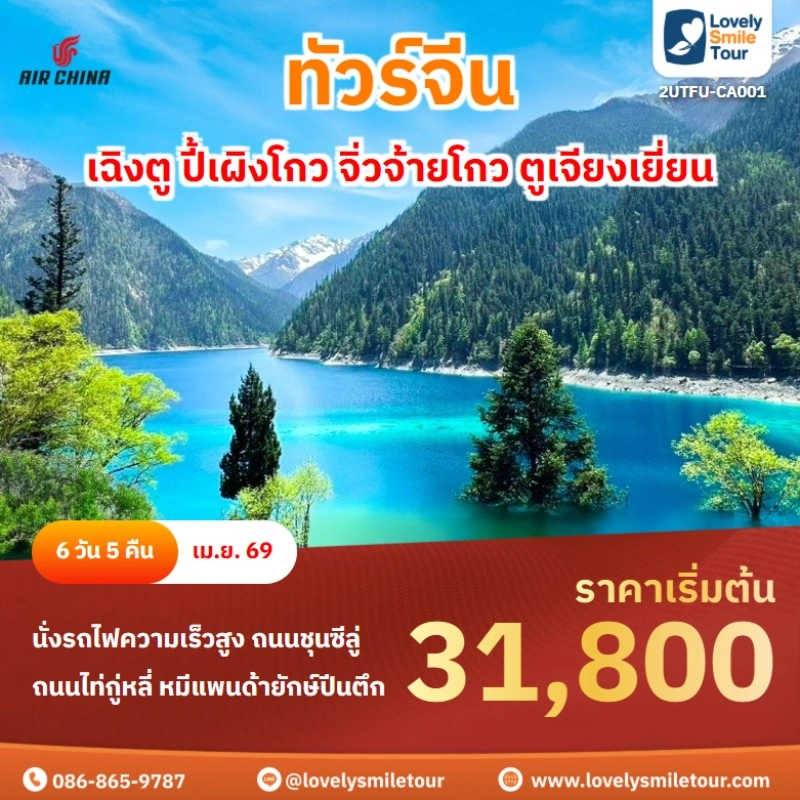 Lovely Smile Tour มีแพ็กเกจ ทัวร์จิ่วจ้ายโกว ให้เลือกหลายรูปแบบ มีทั้งแบบไม่เข้าร้านรัฐบาลและแบบเข้าร้านรัฐบาล แบบรวมค่ารถอุทยานและแบบยังไม่รวม พักโรงแรมระดับ 4-5 ดาว สายการบินมีทั้งแบบ Full Service และ Low Cost บางแพ็กเกจได้นั่งรถไฟความเร็วสูง หากสนใจจองแพ็กเกจไหน แอดไลน์หรือโทรสอบถามได้เลย