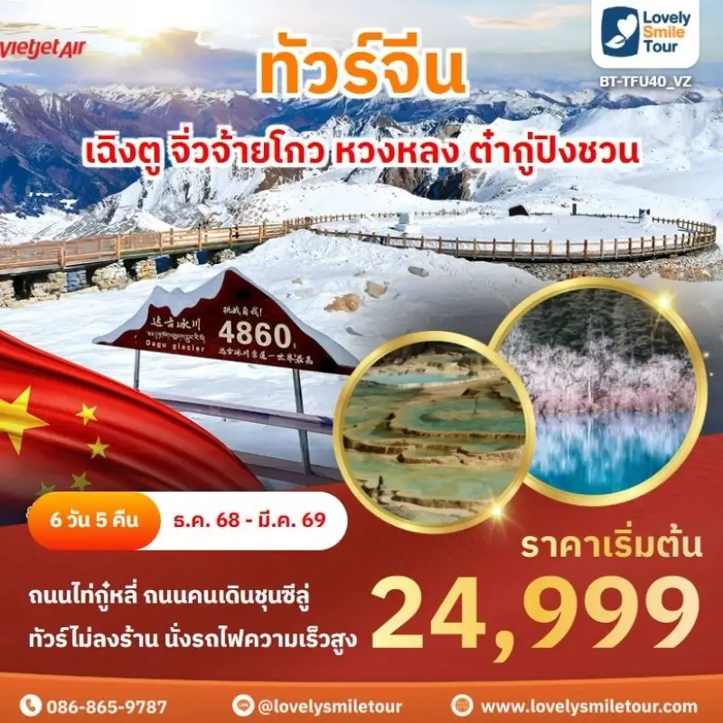Lovely Smile Tour มีแพ็กเกจ ทัวร์จิ่วจ้ายโกว ให้เลือกหลายรูปแบบ มีทั้งแบบไม่เข้าร้านรัฐบาลและแบบเข้าร้านรัฐบาล แบบรวมค่ารถอุทยานและแบบยังไม่รวม พักโรงแรมระดับ 4-5 ดาว สายการบินมีทั้งแบบ Full Service และ Low Cost บางแพ็กเกจได้นั่งรถไฟความเร็วสูง หากสนใจจองแพ็กเกจไหน แอดไลน์หรือโทรสอบถามได้เลย