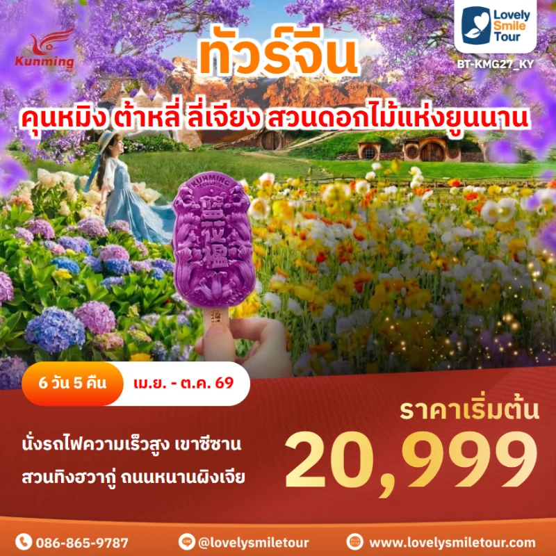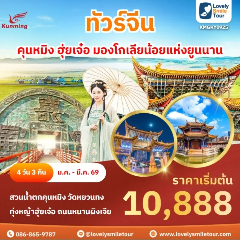 Lovely Smile Tour มีแพ็กเกจ ทัวร์คุนหมิง ต้าหลี่ ลี่เจียง แชงกรีล่า ภูเขาหิมะมังกรหยก ให้เลือกหลายรูปแบบ มีทั้งแบบไม่เข้าร้านรัฐบาลและแบบเข้าร้านรัฐบาล พักโรงแรมระดับ 4-5 ดาว สายการบินมีทั้งแบบ Full Service และ Low Cost บางแพ็กเกจได้นั่งรถไฟความเร็วสูง หากสนใจจองแพ็กเกจไหน แอดไลน์หรือโทรสอบถามได้เลย