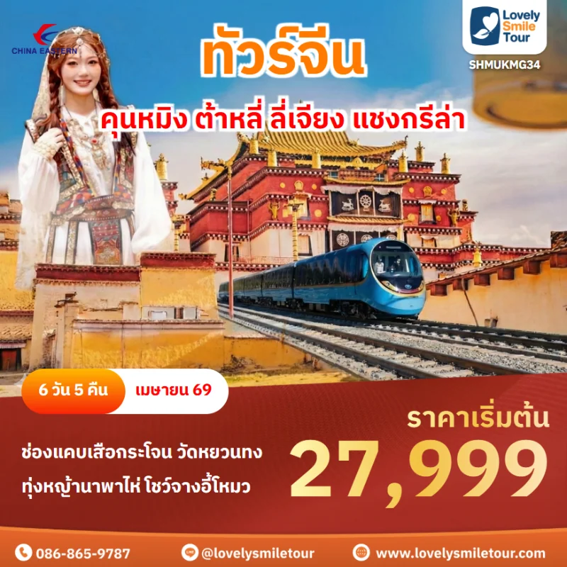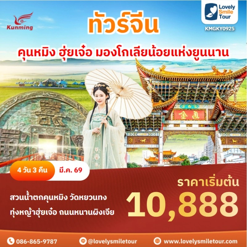 Lovely Smile Tour มีแพ็กเกจ ทัวร์คุนหมิง ต้าหลี่ ลี่เจียง แชงกรีล่า ภูเขาหิมะมังกรหยก ให้เลือกหลายรูปแบบ มีทั้งแบบไม่เข้าร้านรัฐบาลและแบบเข้าร้านรัฐบาล พักโรงแรมระดับ 4-5 ดาว สายการบินมีทั้งแบบ Full Service และ Low Cost บางแพ็กเกจได้นั่งรถไฟความเร็วสูง หากสนใจจองแพ็กเกจไหน แอดไลน์หรือโทรสอบถามได้เลย