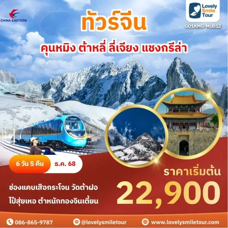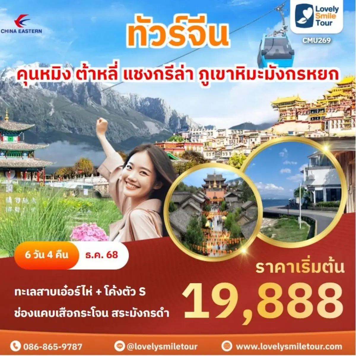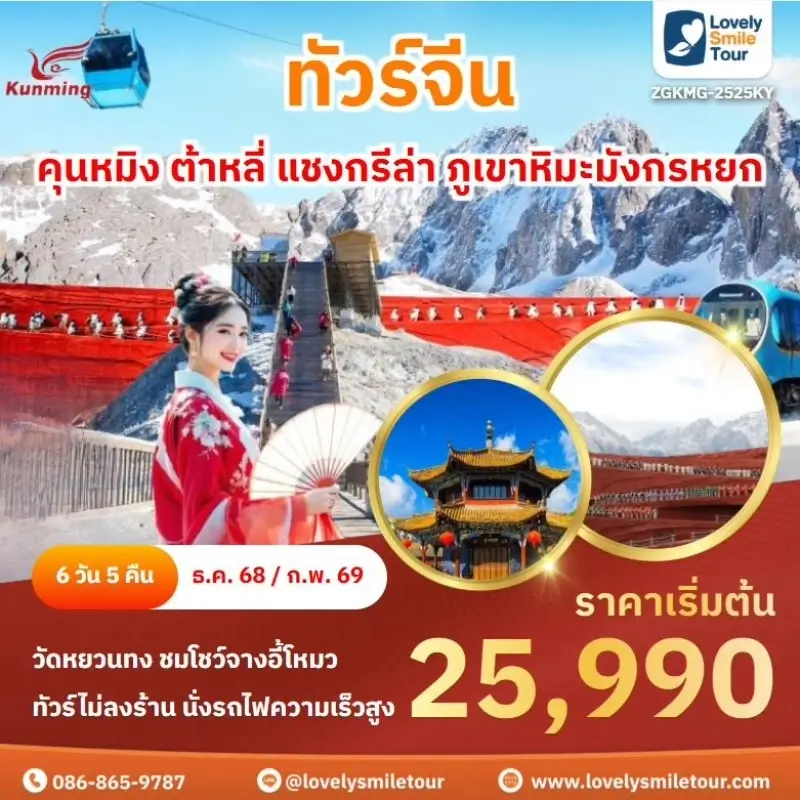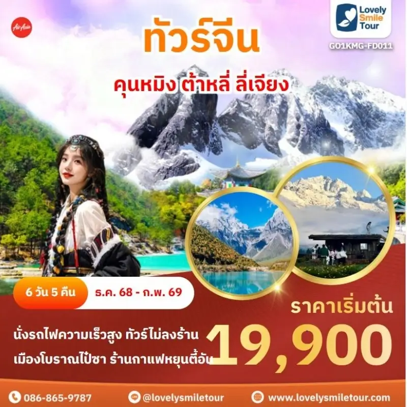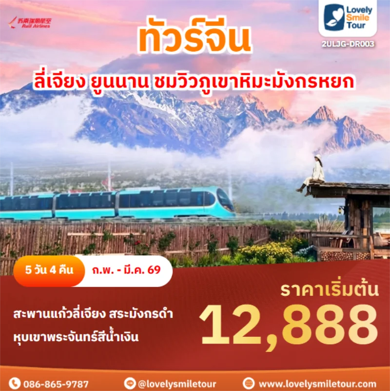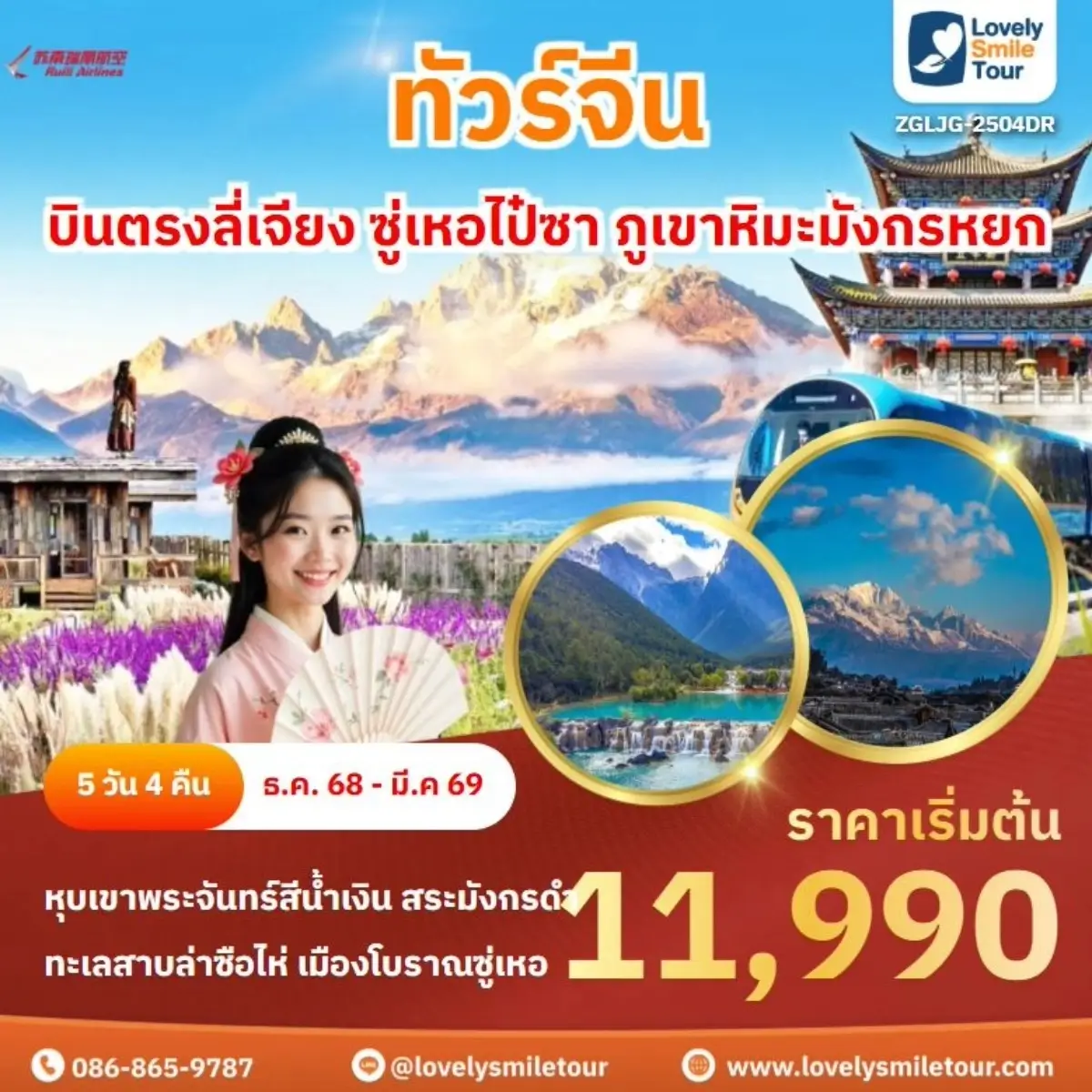 Lovely Smile Tour มีแพ็กเกจ ทัวร์ลี่เจียง ภูเขาหิมะมังกรหยก ให้เลือกหลายรูปแบบ มีทั้งแบบไม่เข้าร้านรัฐบาลและแบบเข้าร้านรัฐบาล พักโรงแรมระดับ 4-5 ดาว บางโปรแกรมมีให้นั่งรถไฟความเร็วสูง หากสนใจจองแพ็กเกจไหน แอดไลน์หรือโทรสอบถามได้เลย