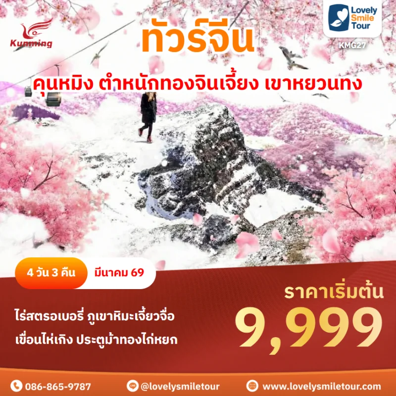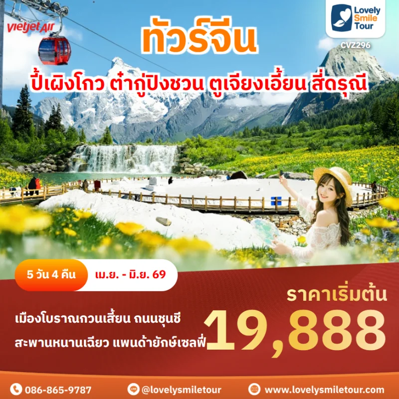 Lovely Smile Tour มีแพ็กเกจ ทัวร์จีน ให้เลือกหลายรูปแบบ หลากหลายเมือง อาทิเช่น กำแพงเมืองจีน จางเจียเจี้ย คุณหมิง ต้าหลี่ ลี่เจียง แชงกรีล่า เซี่ยงไฮ้ ปักกิ่ง ฉงชิ่ง ที่สำคัญมีแบบไม่เข้าร้านรัฐบาลด้วย หรือถ้าชอบทัวร์จีน ราคาถูก หรือแบบ 5 ดาว ก็มีเช่นกัน นอกจากนี้ โปรแกรมทัวร์จะแตกต่างกันในเรื่องสายการบิน ระดับโรงแรม ร้านอาหารมื้อพิเศษ สนใจจองแพ็กเกจไหน แอดไลน์หรือโทรสอบถามได้เลย