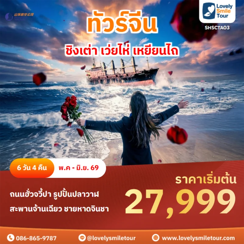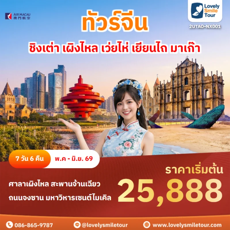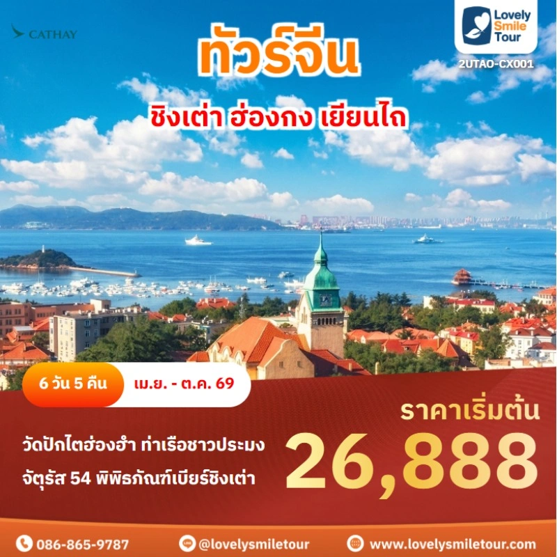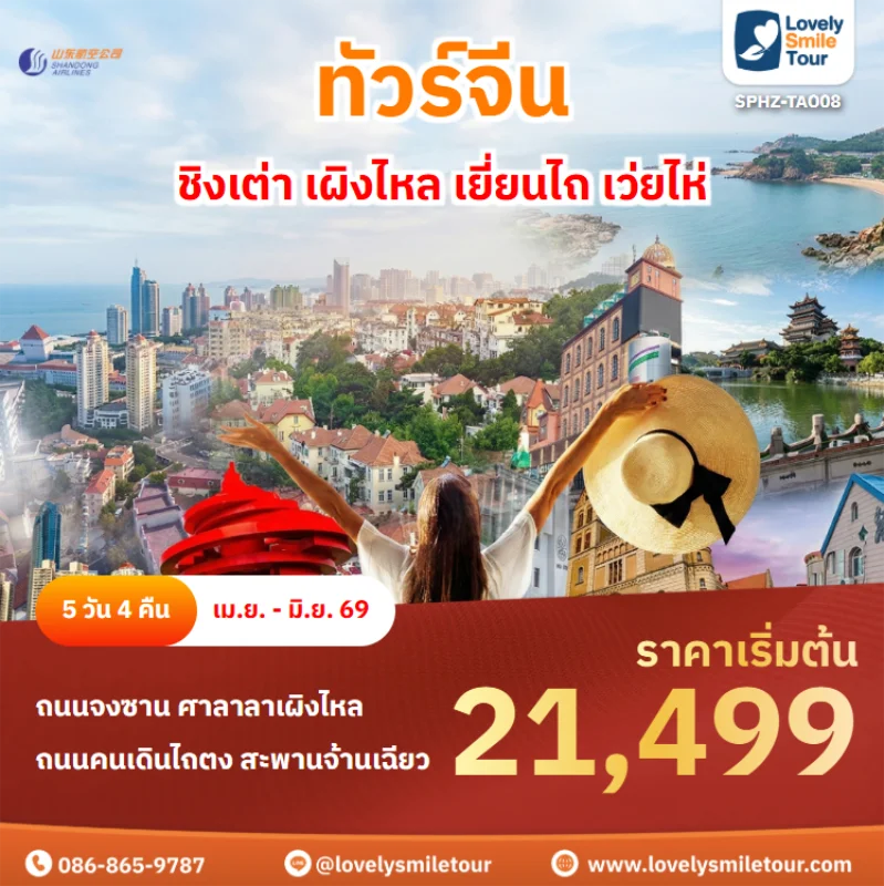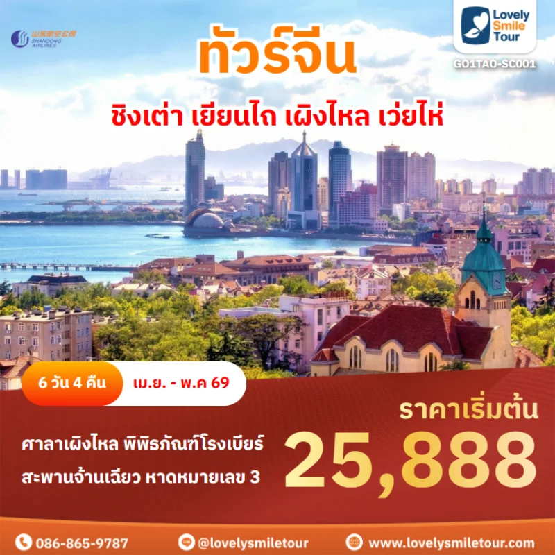 Lovely Smile Tour มีแพ็กเกจ ทัวร์ชิงเต่า ให้เลือกหลายรูปแบบ มีทั้งแบบไม่เข้าร้านรัฐบาลและแบบเข้าร้านรัฐบาล พักโรงแรมระดับ 4-5 ดาว บางโปรแกรมมีให้นั่งรถไฟความเร็วสูง หากสนใจจองแพ็กเกจไหน แอดไลน์หรือโทรสอบถามได้เลย
