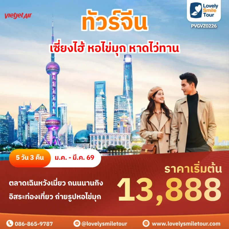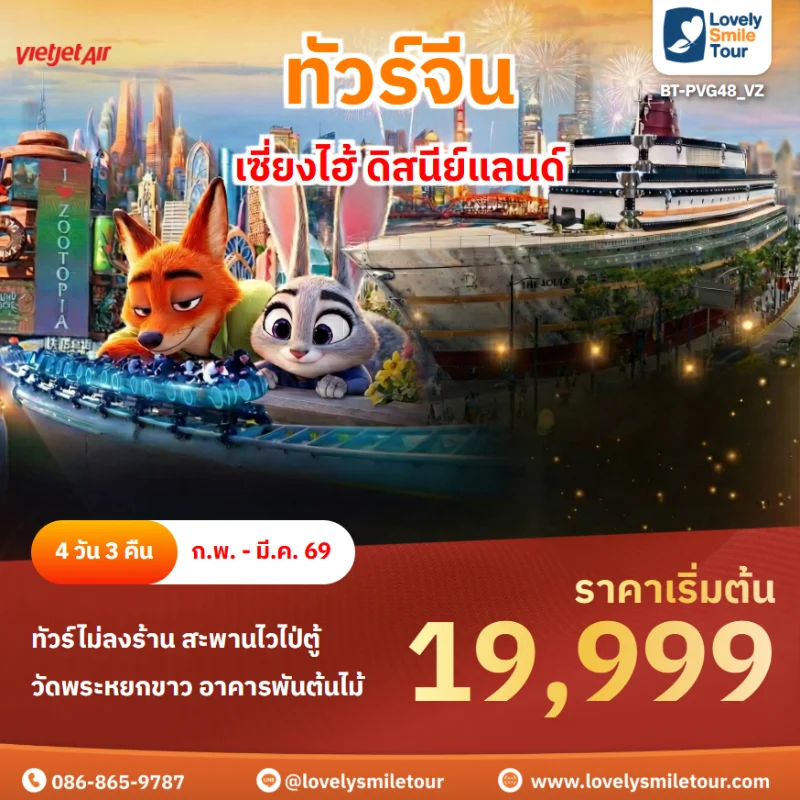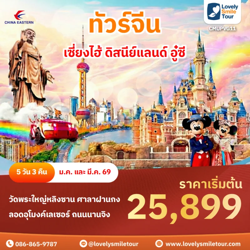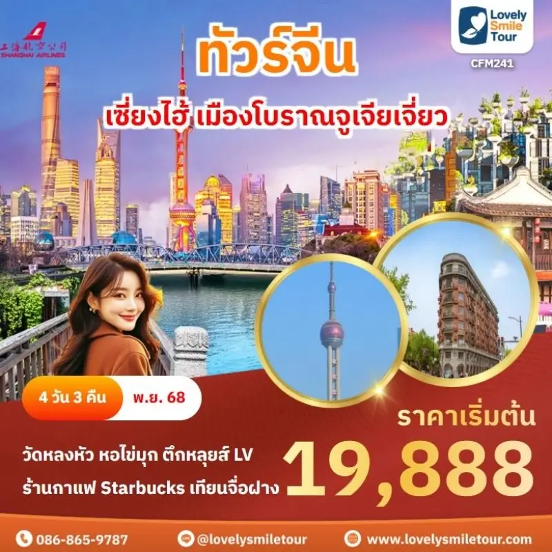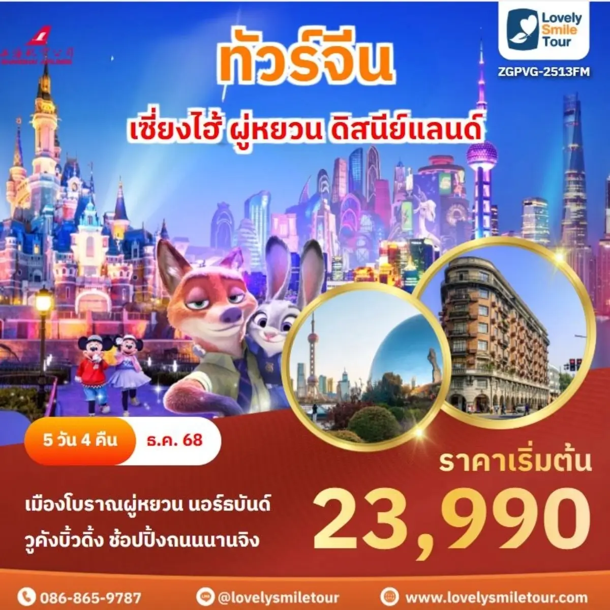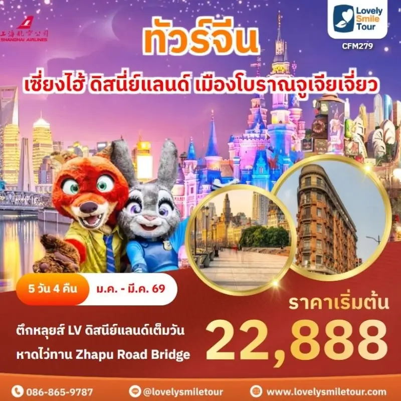Lovely Smile Tour มีแพ็กเกจ ทัวร์เซี่ยงไฮ้ ให้เลือกหลายรูปแบบ มีทั้งแบบไม่เข้าร้านรัฐบาลและแบบเข้าร้านรัฐบาล แบบพาเที่ยวทุกวันหรือแบบมีวันอิสระเที่ยวเอง หรือจะไปเที่ยวเซี่ยงไฮ้ดิสนีย์แลนด์ก็ได้ พักโรงแรมระดับ 4-5 ดาว สายการบินมีทั้งแบบ Full Service และ Low Cost หากสนใจจองแพ็กเกจไหน แอดไลน์หรือโทรสอบถามได้เลย