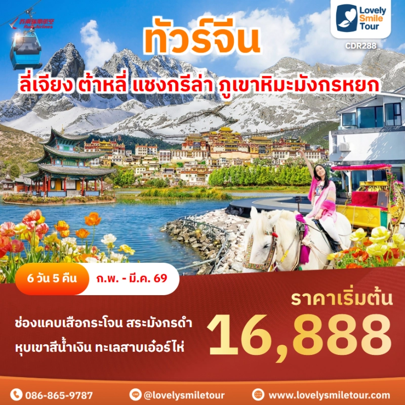 Lovely Smile Tour มีแพ็กเกจ ทัวร์แชงกรีล่า ภูเขาหิมะมังกรหยก ให้เลือกหลายรูปแบบ มีทั้งแบบไม่เข้าร้านรัฐบาลและแบบเข้าร้านรัฐบาล พักโรงแรมระดับ 4-5 ดาว สายการบินมีทั้งแบบ Full Service และ Low Cost หากสนใจจองแพ็กเกจไหน แอดไลน์หรือโทรสอบถามได้เลย